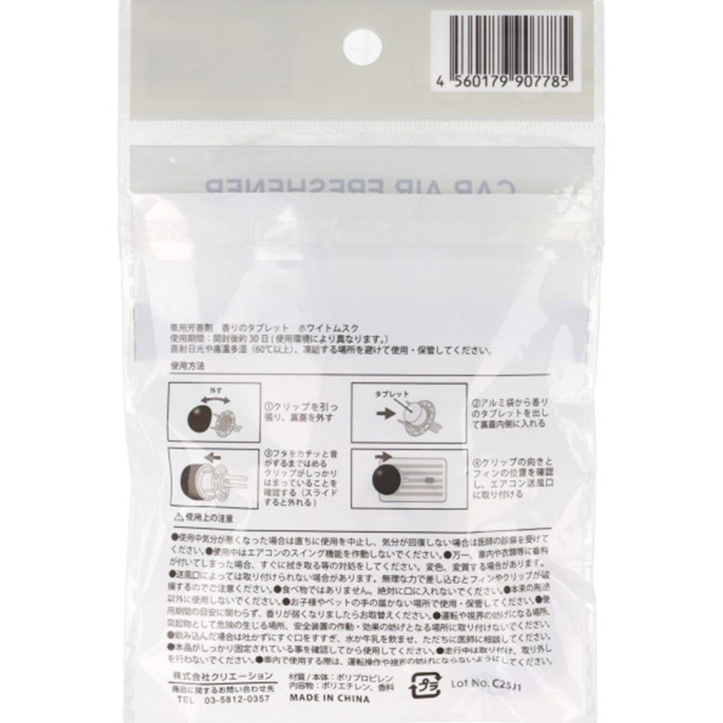エアコンルーバーに取り付けるタイプの車用芳香剤です。ホワイトムスクの香りで、タブレット形状なため液漏れの心配がありません。開封後約30日間の使用期間があります。