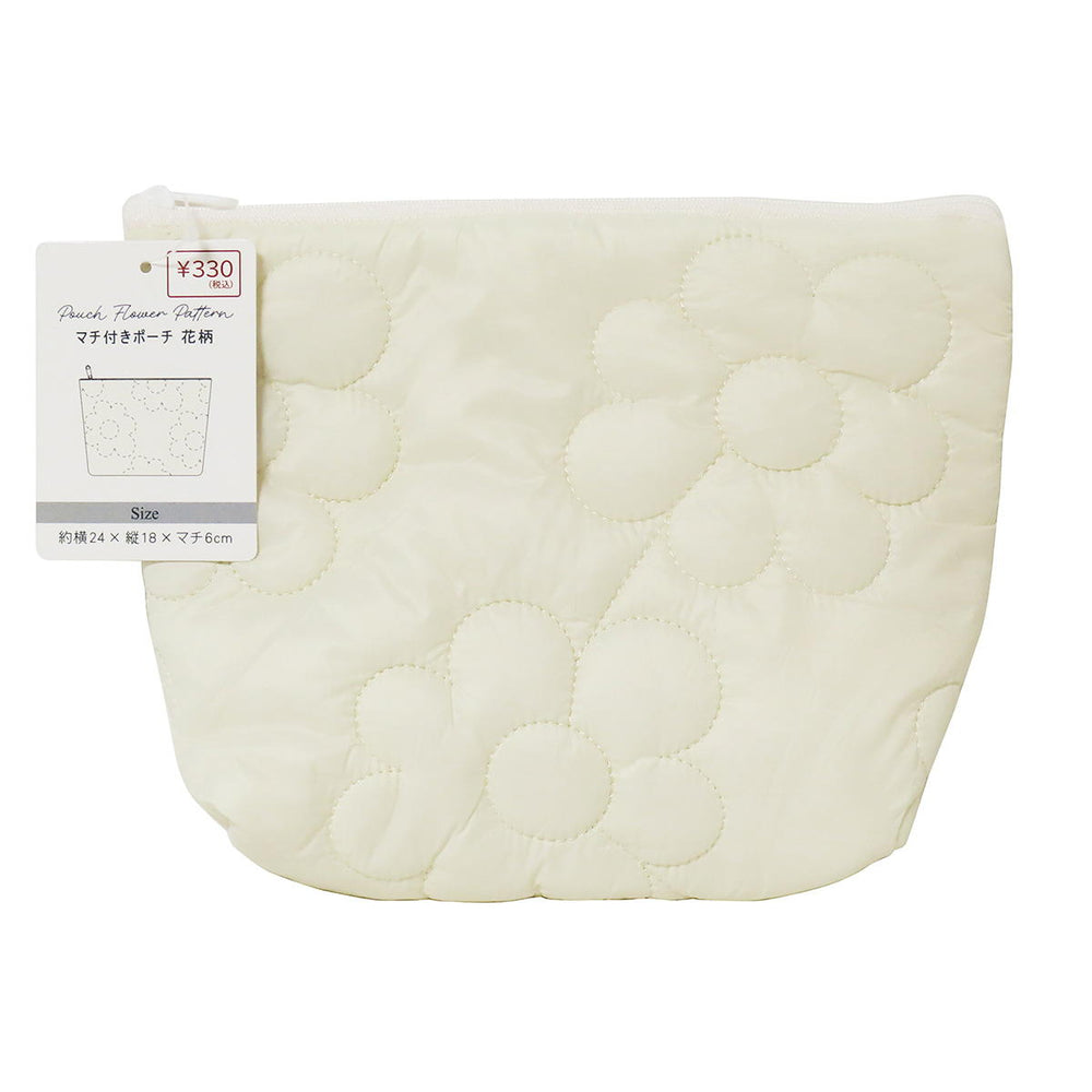 中綿入りのフワフワした素材の花柄ポーチ、マチありタイプでたくさん入ります。