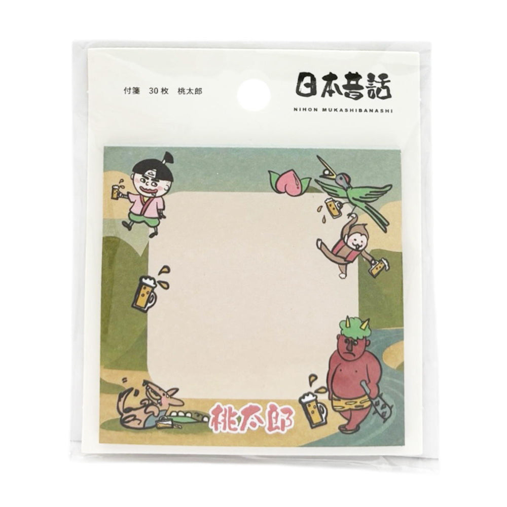 充実した桃太郎パロディデザインの付箋30枚入りです。サイズは約縦7.5×横7.5cmで、標準的なメモサイズです。粘着力も適度にあり、複数回貼り直しても使用できます。