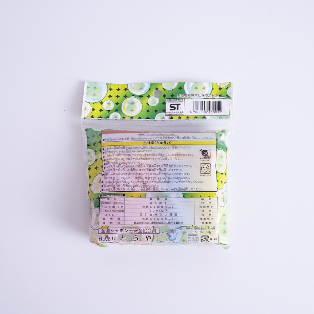 本商品は、日本玩具協会が定める玩具安全基準に適合した「STマーク」付きのしゃぼん玉です。製造は日本国内で行われており、基準に沿った品質管理のもとで作られています。対象年齢は3歳以上。使用上の注意がしっかり記載されており、保護者の方にも配慮された仕様となっています。