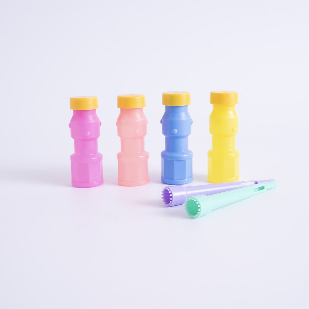 ボトルはイエロー・グリーン・オレンジ・ブルーの4色入りで、子どもたちの目を引くカラフルな色合いが特徴です。色を選びながら遊ぶことで、楽しさも広がります。プレゼントやイベント用にも活用しやすく、見た目の楽しさが遊び心をくすぐるデザインになっています。