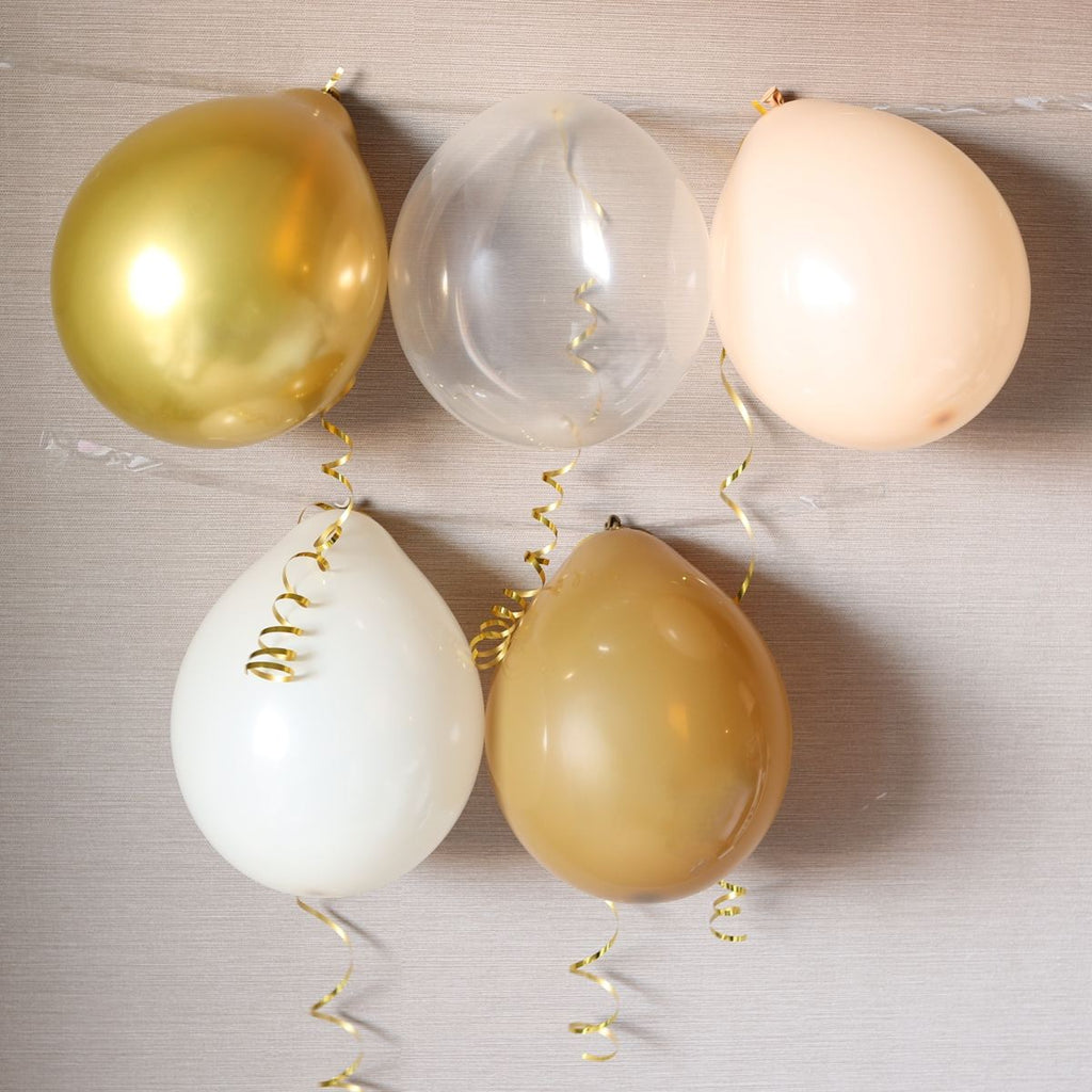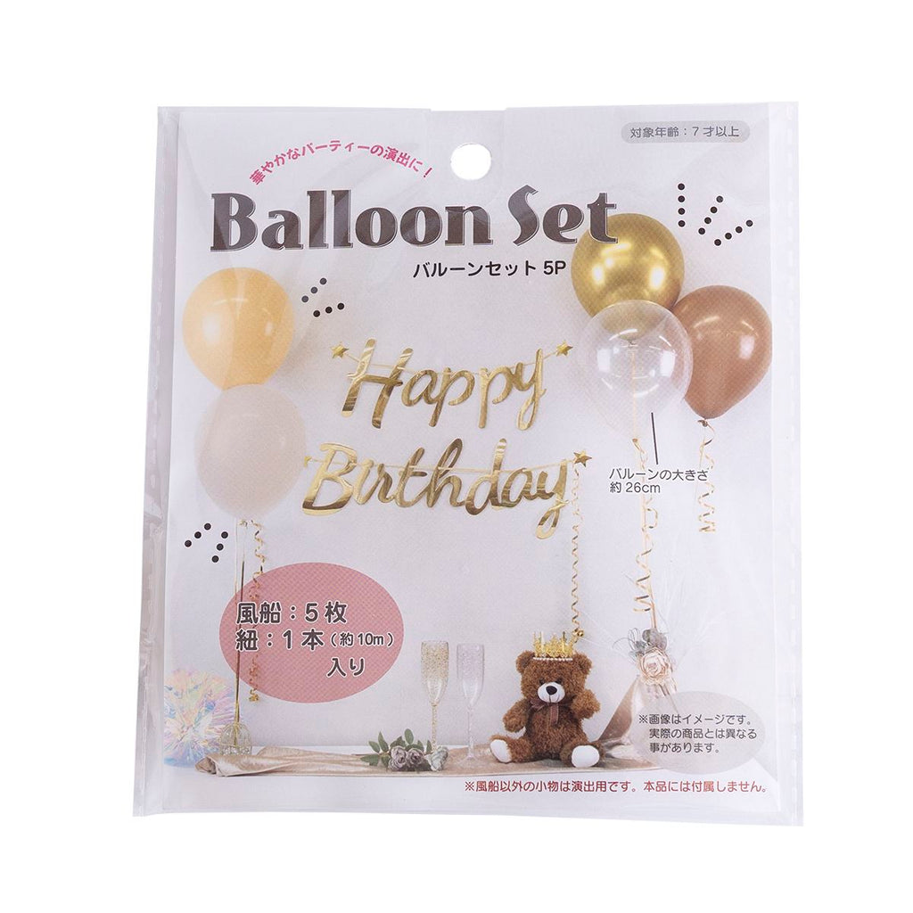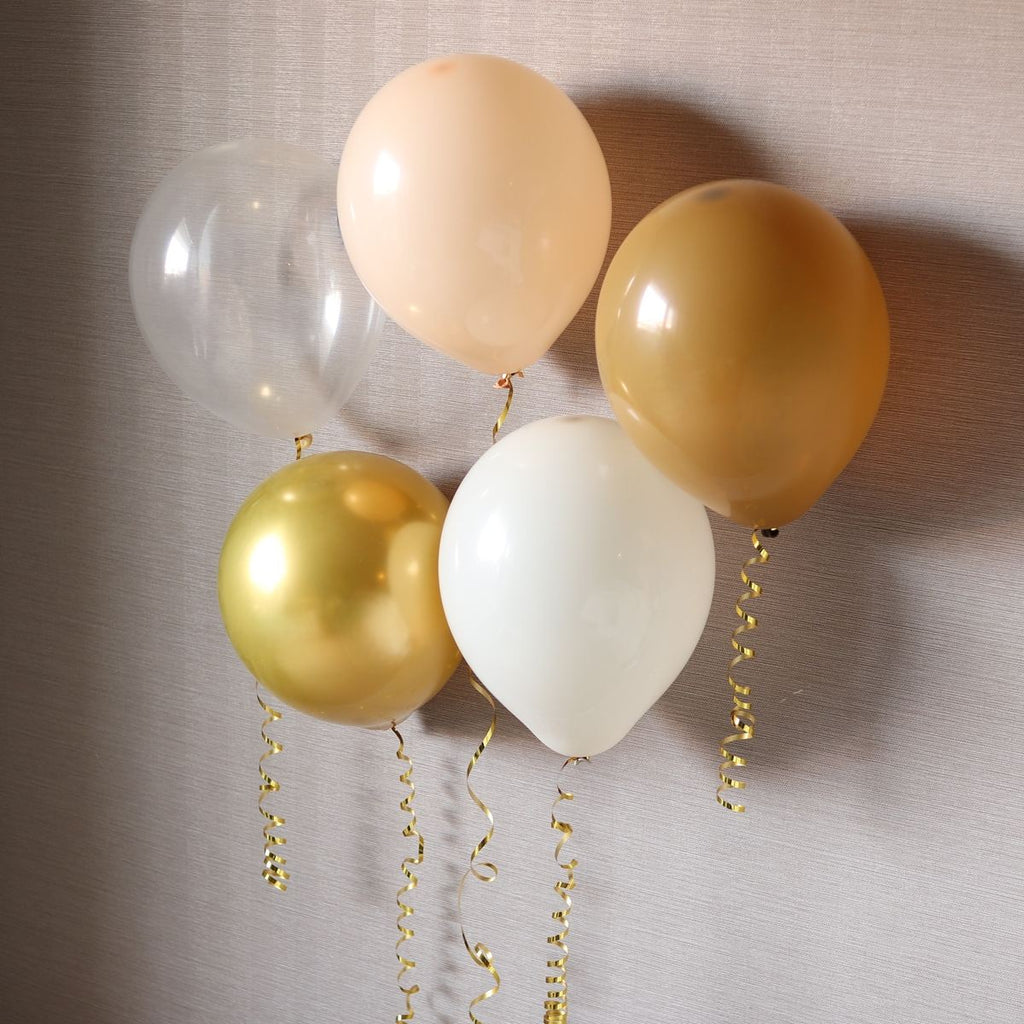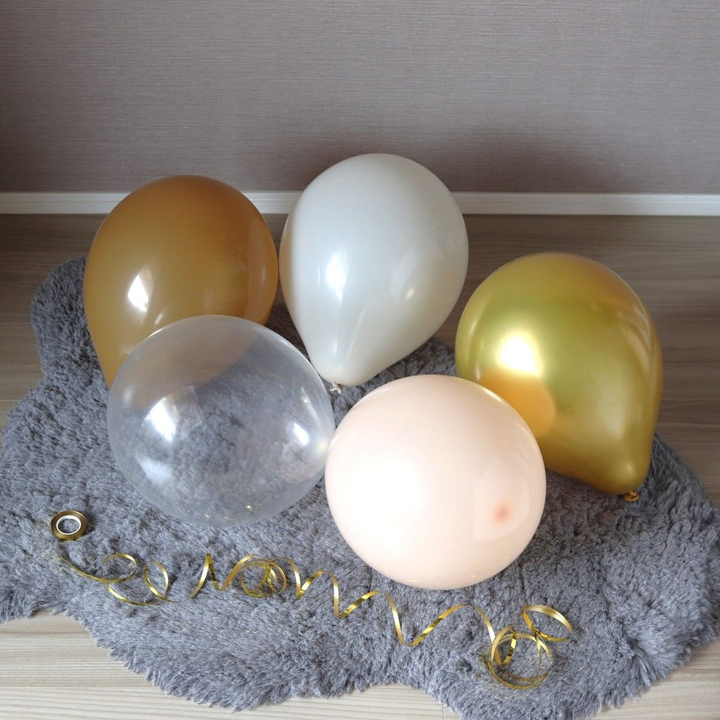 バルーンセット5Pは、トレンド感のあるナチュラル系カラーで統一された、落ち着きと華やかさを兼ね備えた風船セットです。ゴールド、ベージュ、ホワイト、クリアなどの上品な色味が、シンプルながらも印象的なデコレーションを演出。お子さまの誕生日はもちろん、大人のパーティーやウェディングにもぴったりです。どんな空間にも自然となじみ、おしゃれなアクセントになります。