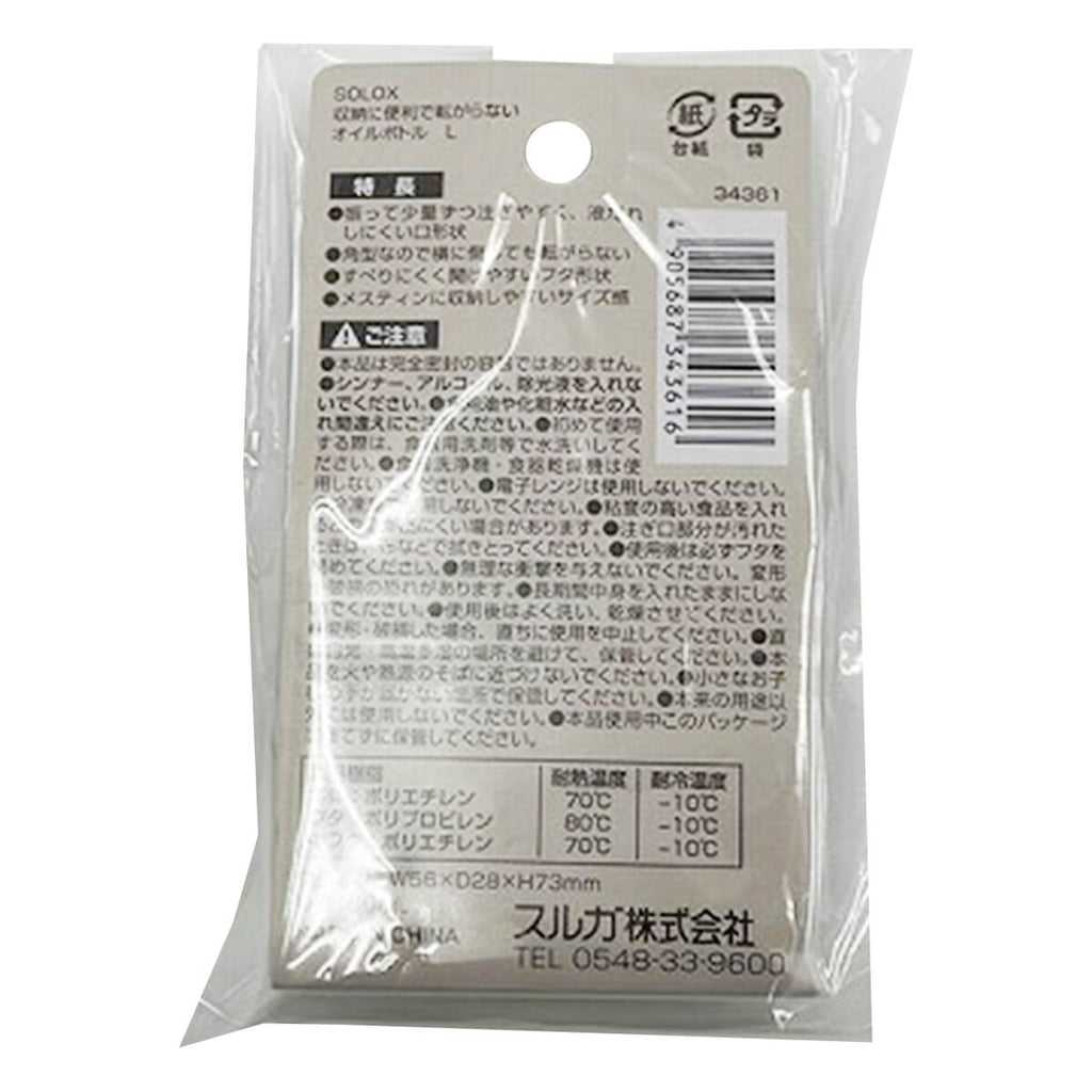 角型なので横に倒しても転がりにくく、振って少量ずつ注ぎやすい。また液だれしにくい口形状です。メスティンにも収納しやすい。