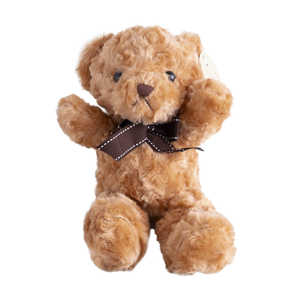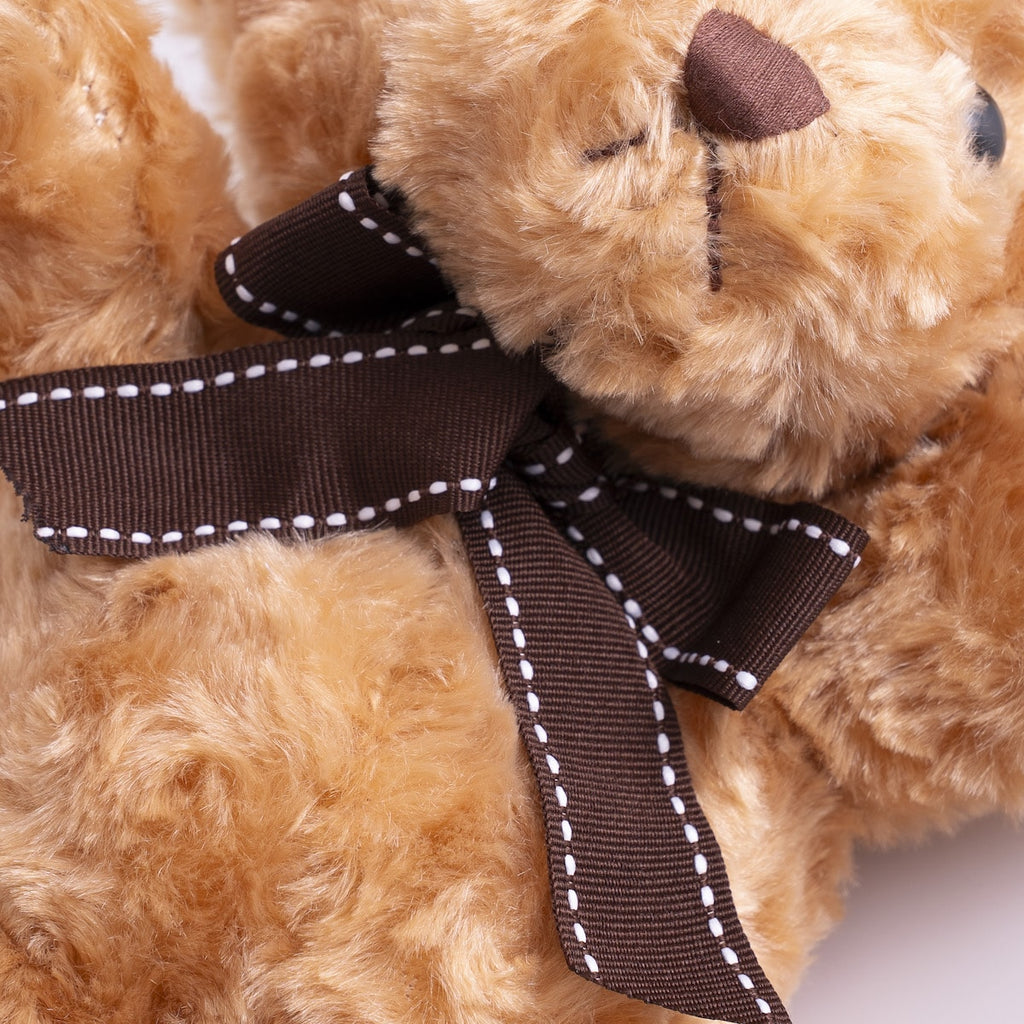 首元にあしらわれたリボンは、濃いブラウンにステッチが施されたデザイン。シンプルながらもアクセントになり、ぬいぐるみ全体の印象を引き締めています。贈りものにも取り入れやすく、年代や性別を問わず手に取りやすいデザインです。