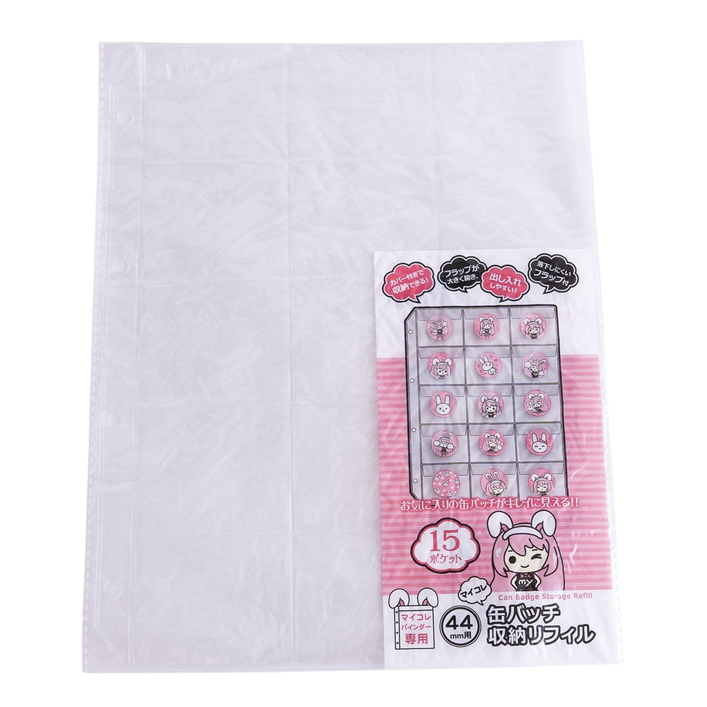 このリフィルは、44mmサイズの缶バッジを最大15個収納できる専用ポケット付きファイルシートです。ひと目で見渡せるレイアウトで、並べ替えやコレクションの管理もスムーズ。お気に入りの“推し缶”を並べて楽しむことで、コレクションの充実感がさらに高まります。バッジを傷や汚れから守りながら、整理整頓も叶えるアイテムです。