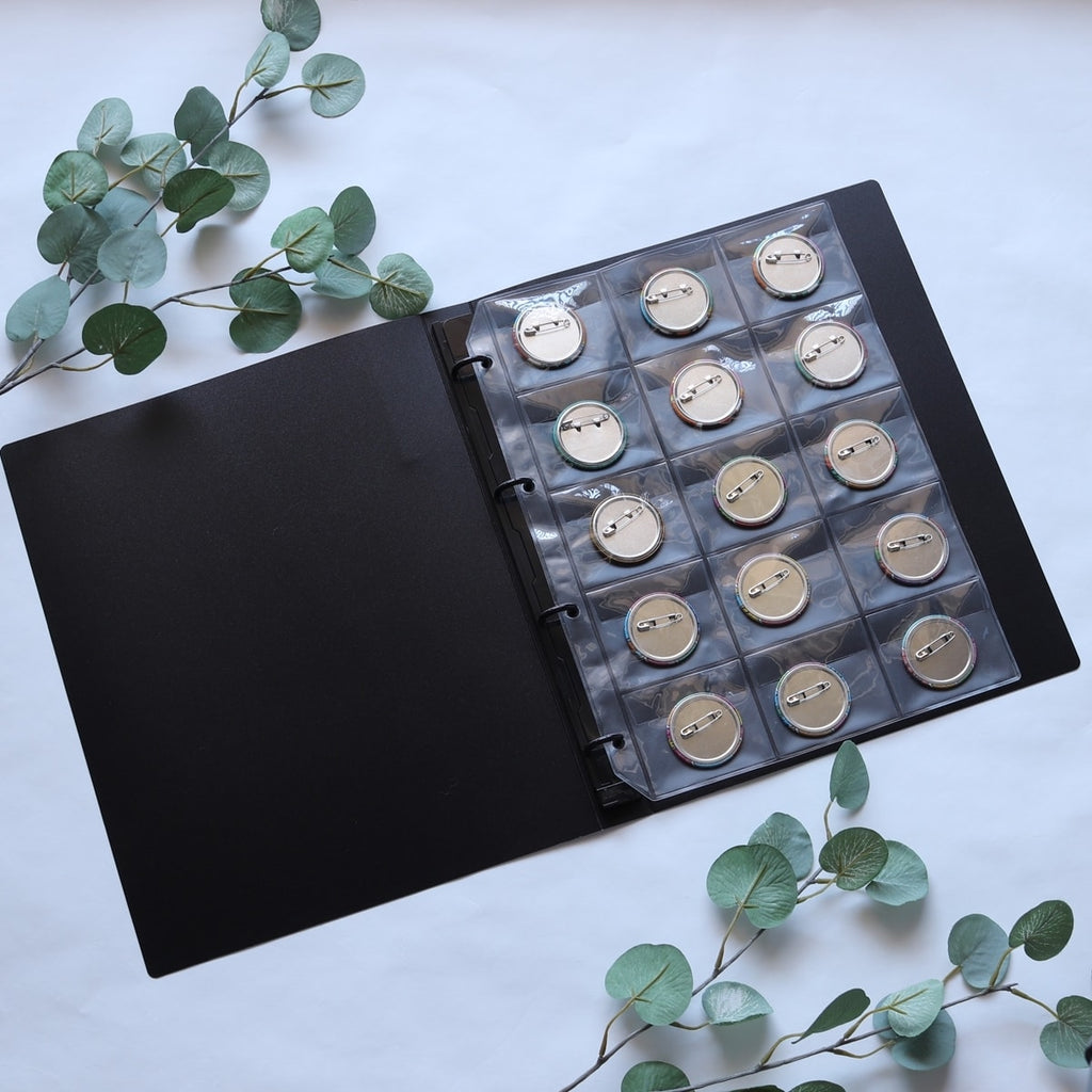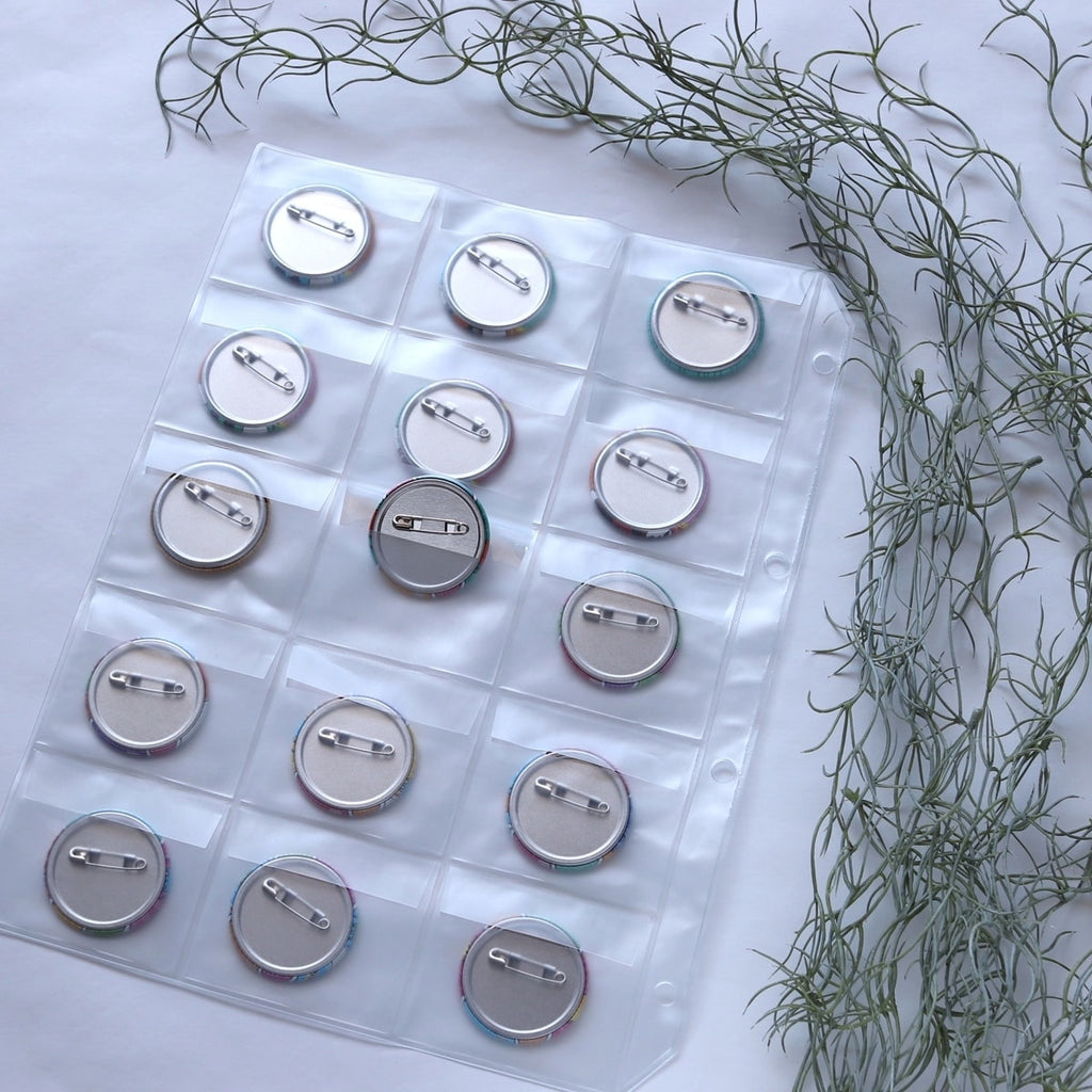 ポケット部分は透明素材でできており、中に収納した缶バッジの絵柄がはっきり見える構造。缶バッジ同士が擦れないように個別に分かれており、コレクションの美しさを長く保ちます。厚みのある缶バッジ(最大9mmまで)にも対応しており、実用性にも優れた仕様です。