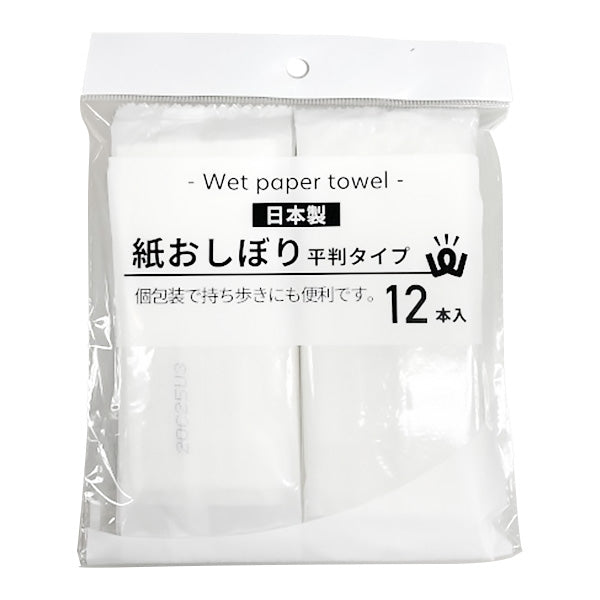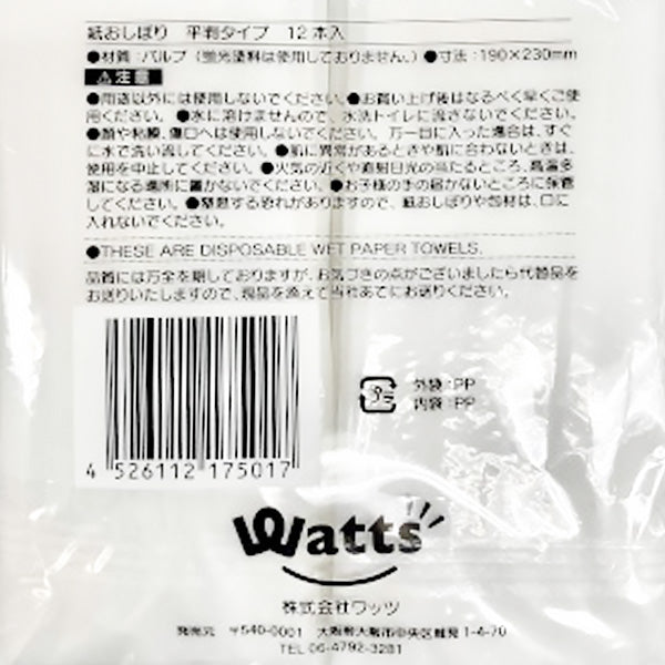 こちらはワッツが自信を持ってオススメするPB(プライベートブランド)でシンプルなホワイトの紙おしぼり、平判タイプ、12本セットです。
