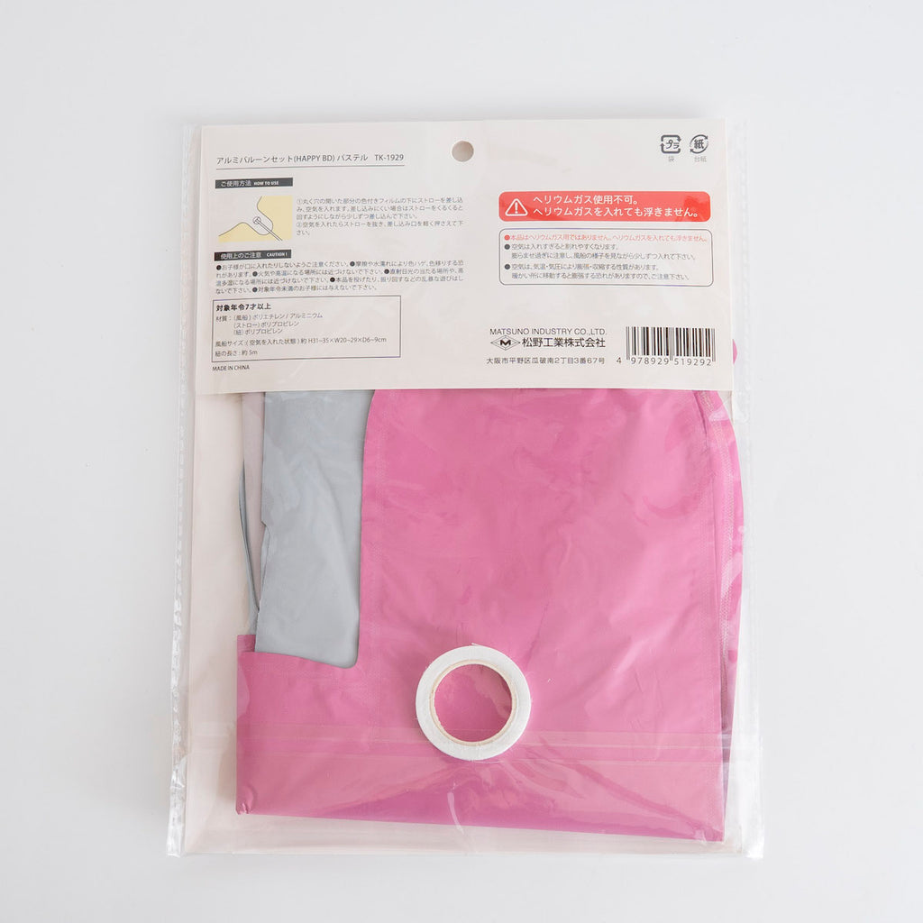 | 材質 | 風船:ポリエチレン、アルミニウム ストロー:ポリプロピレン 紐:ポリプロピレン |