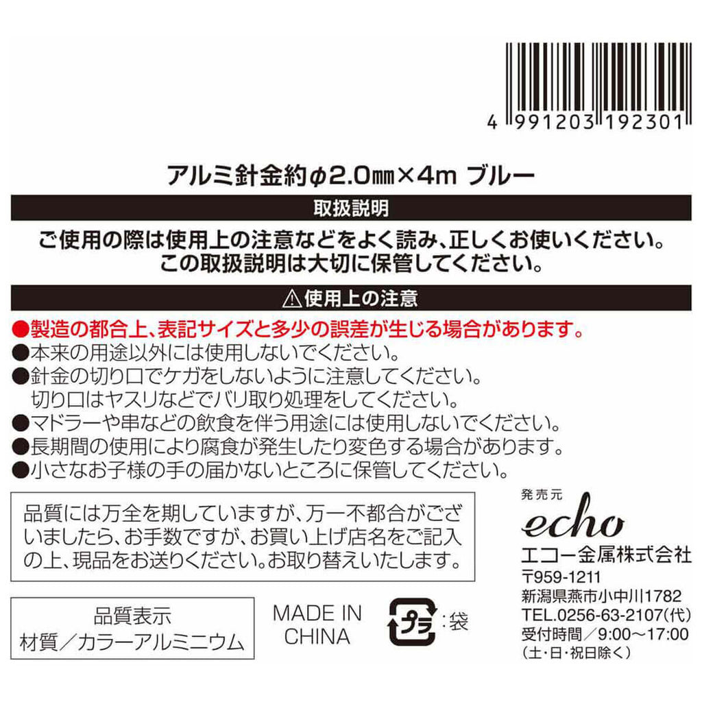 こちらのアイテムは、軽くて曲げやすいアルミ製の針金です。直径2mm 、カラーはブルーです。