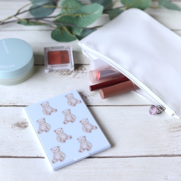 手書き風のくまが散りばめられた、どこか懐かしくて温もりのあるデザインが魅力の携帯ミラー。可愛らしさの中に上品さも感じられ、大人の女性にもぴったりです。ポーチの中で取り出すたびに思わず笑顔になれる、そんな優しさと遊び心を兼ね備えたアイテム。カラーはナチュラルなクリームと爽やかなライトブルーの2色展開で、気分やファッションに合わせて選べます。