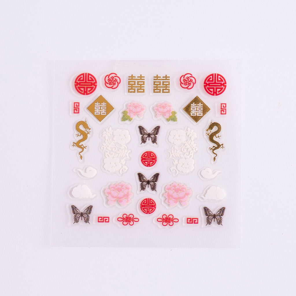 縁起の良いチャイニーズモチーフや花、蝶など、多彩なデザインが揃ったシールセット。レッドやゴールドを基調とした華やかなカラーリングが目を引きます。アクセント使いで遊び心を加えたり、全体を統一感あるデザインでまとめたりと、アレンジ次第で雰囲気が一変。特別な日のネイルにもおすすめです。
