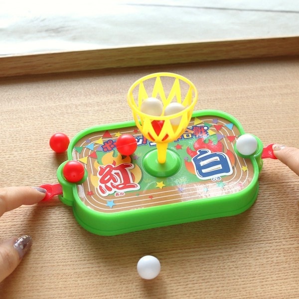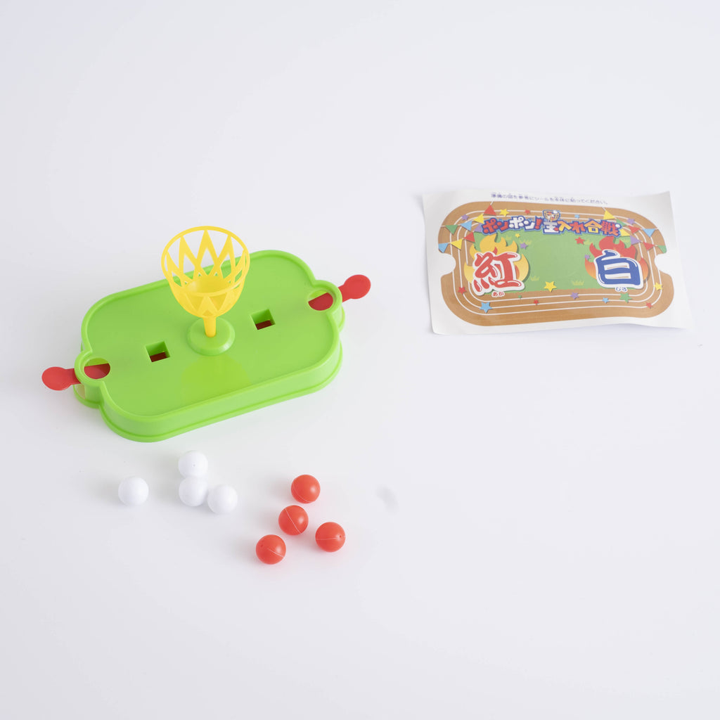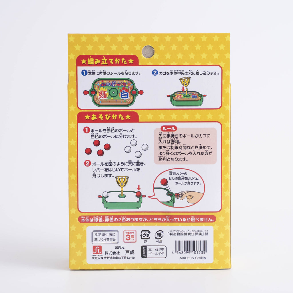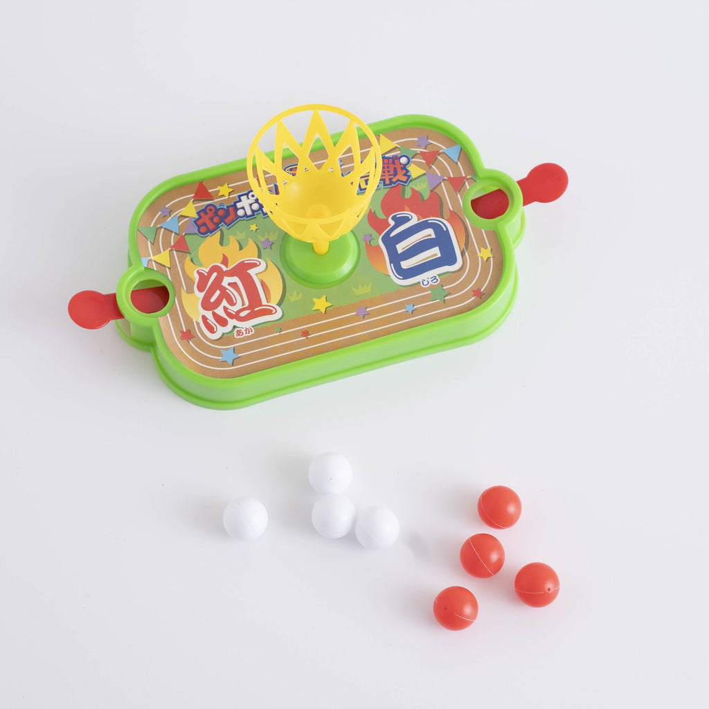 このポンポン玉入れ合戦は、赤と白のボールを交互に飛ばして中央のカゴに入れるだけの簡単ルール。左右のレバーを指ではじくだけなので、小さなお子さまでもすぐに楽しめます。1人でも遊べますが、紅白に分かれて対戦すれば、家族や友だちとの盛り上がりも倍増します!