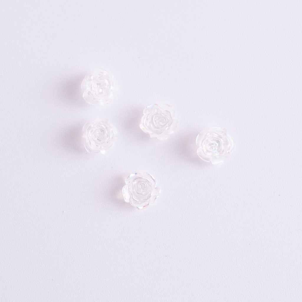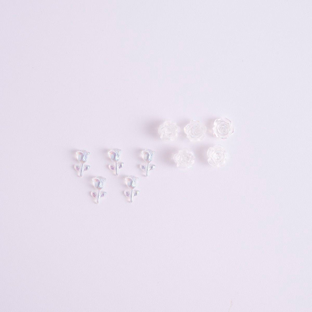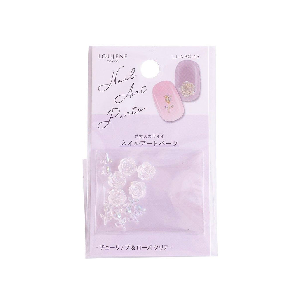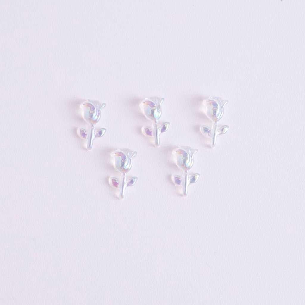 透明感のあるクリア素材に、見る角度で輝きが変わるオーロラ加工を施したネイルパーツです。チューリップとローズの繊細な形状と相まって、指先に上品な華やかさを演出。シンプルなネイルに一点加えるだけで、サロン級の仕上がりを叶えてくれます。