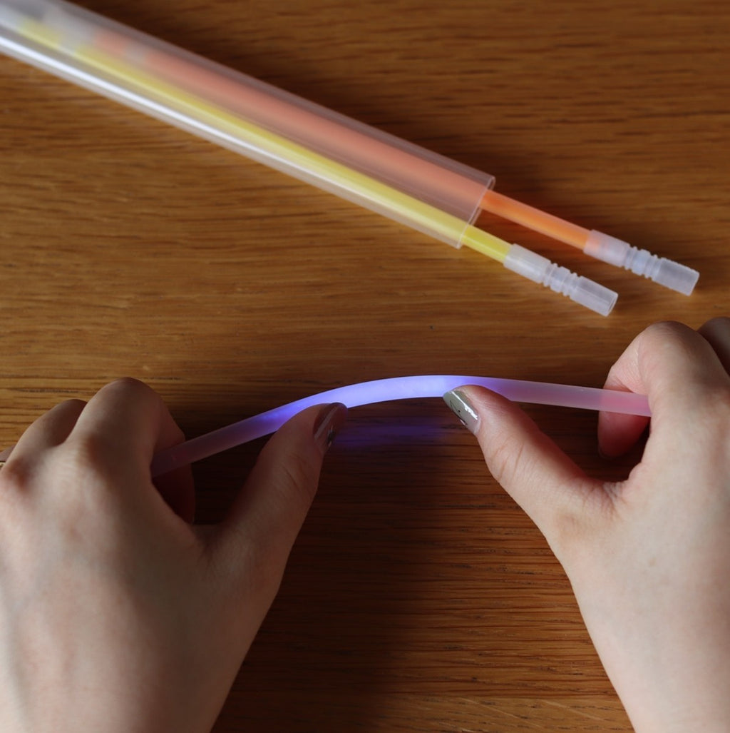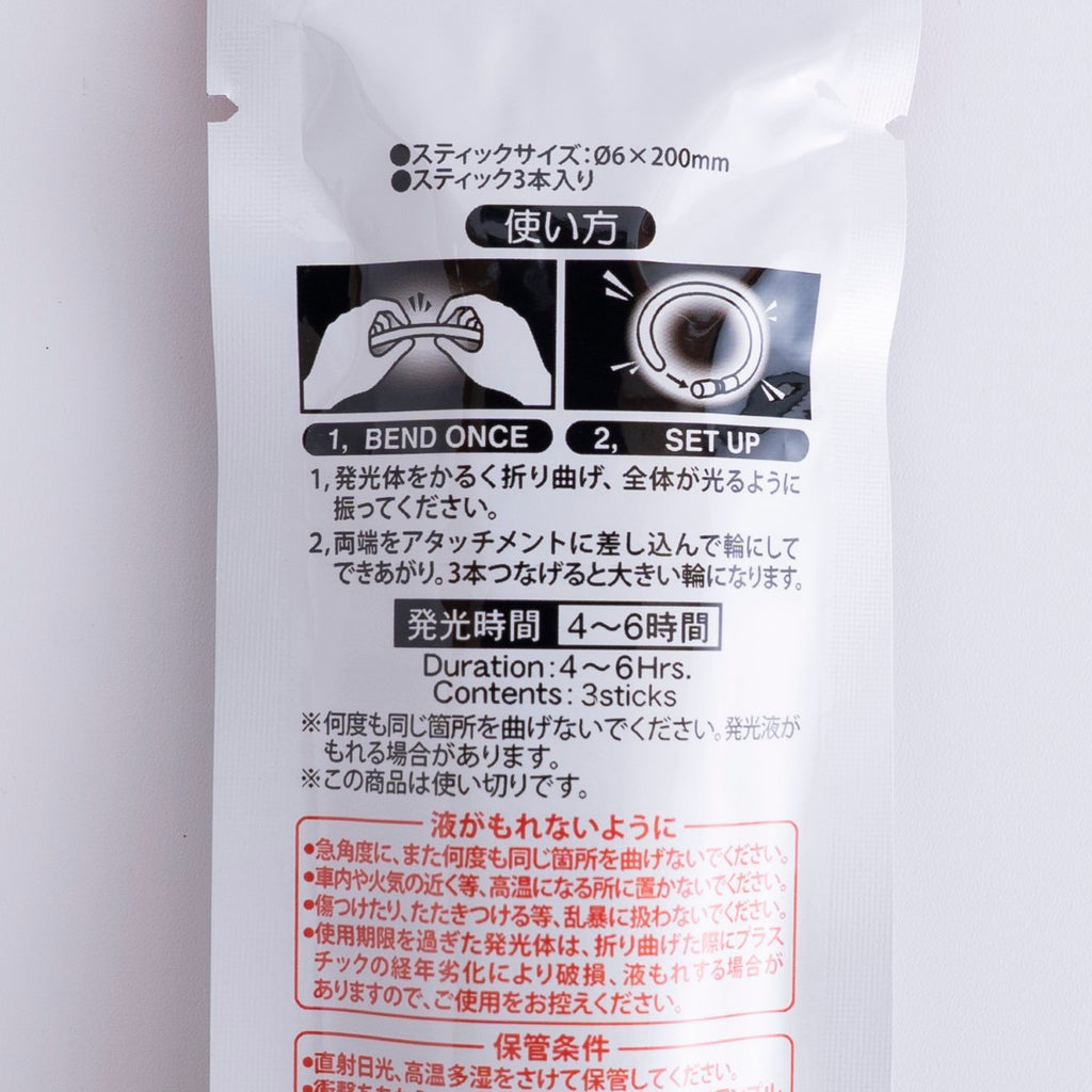 使い方はとてもシンプル。ブレスレットを軽く折り曲げると化学反応で発光が始まり、すぐに明るく輝きます。電池不要で準備いらず、どこでもすぐに使える手軽さが魅力です。小さなお子さま(対象年齢7歳以上)でも扱いやすく、アウトドアやイベントでの即席アクセサリーとしても活躍します。