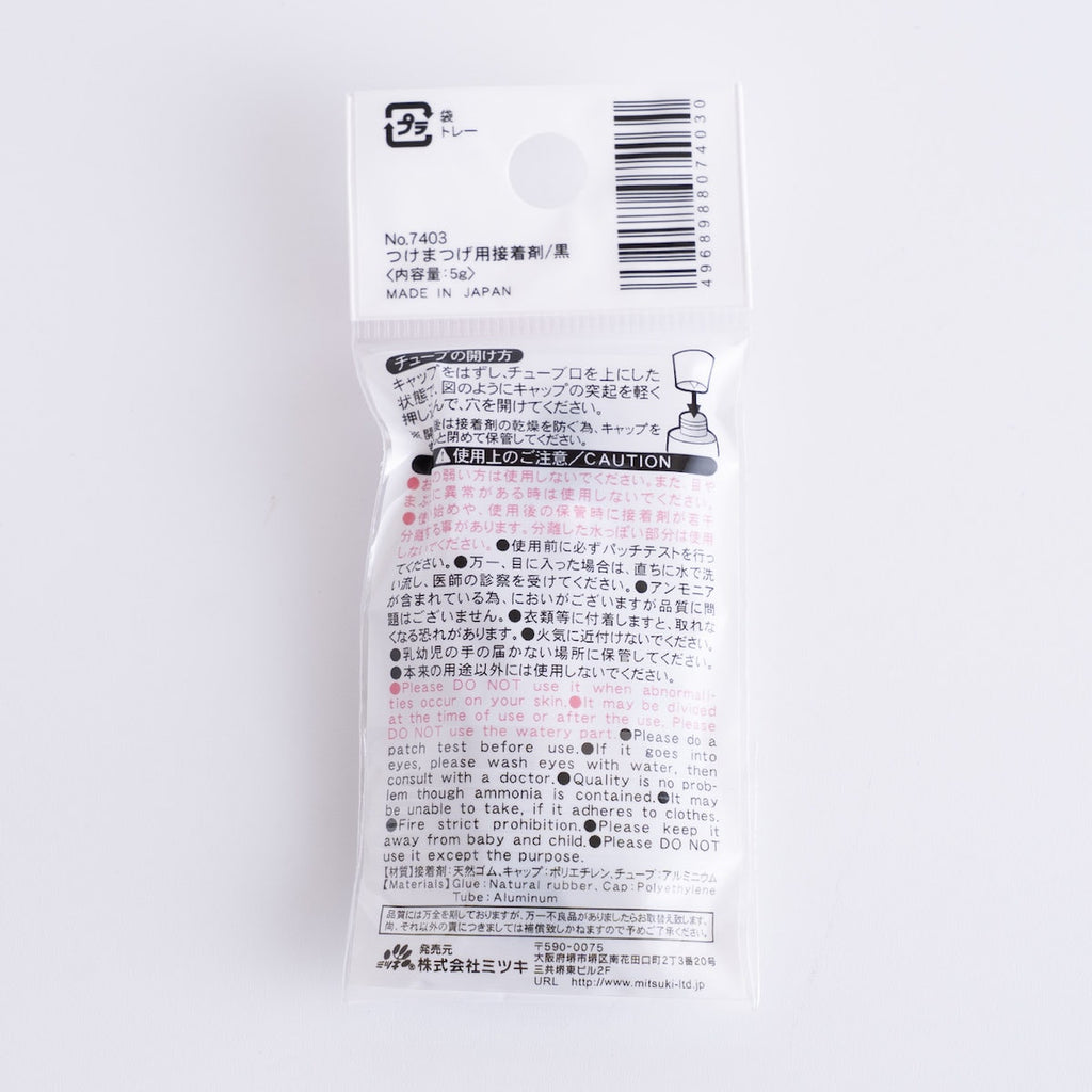 繊細な目元に使うアイテムだからこそ、品質は妥協できません。本接着剤は日本製で、使用されている接着剤は天然ゴムを主成分としています。キャップにはポリエチレン、チューブにはアルミニウム素材を採用し、衛生的かつ扱いやすい設計。目の周りに使うものだからこそ、信頼できる国内製造で、安心して毎日のメイクに取り入れられます。