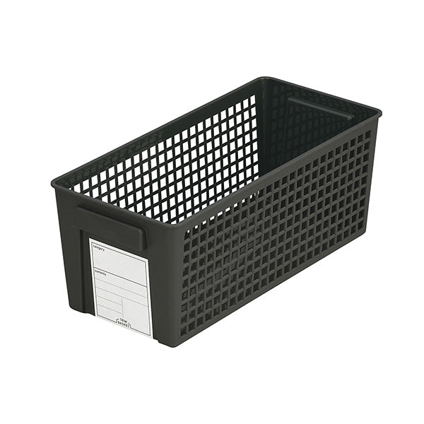 中身を書いておけるラベル付きのバスケット型収納ボックス。