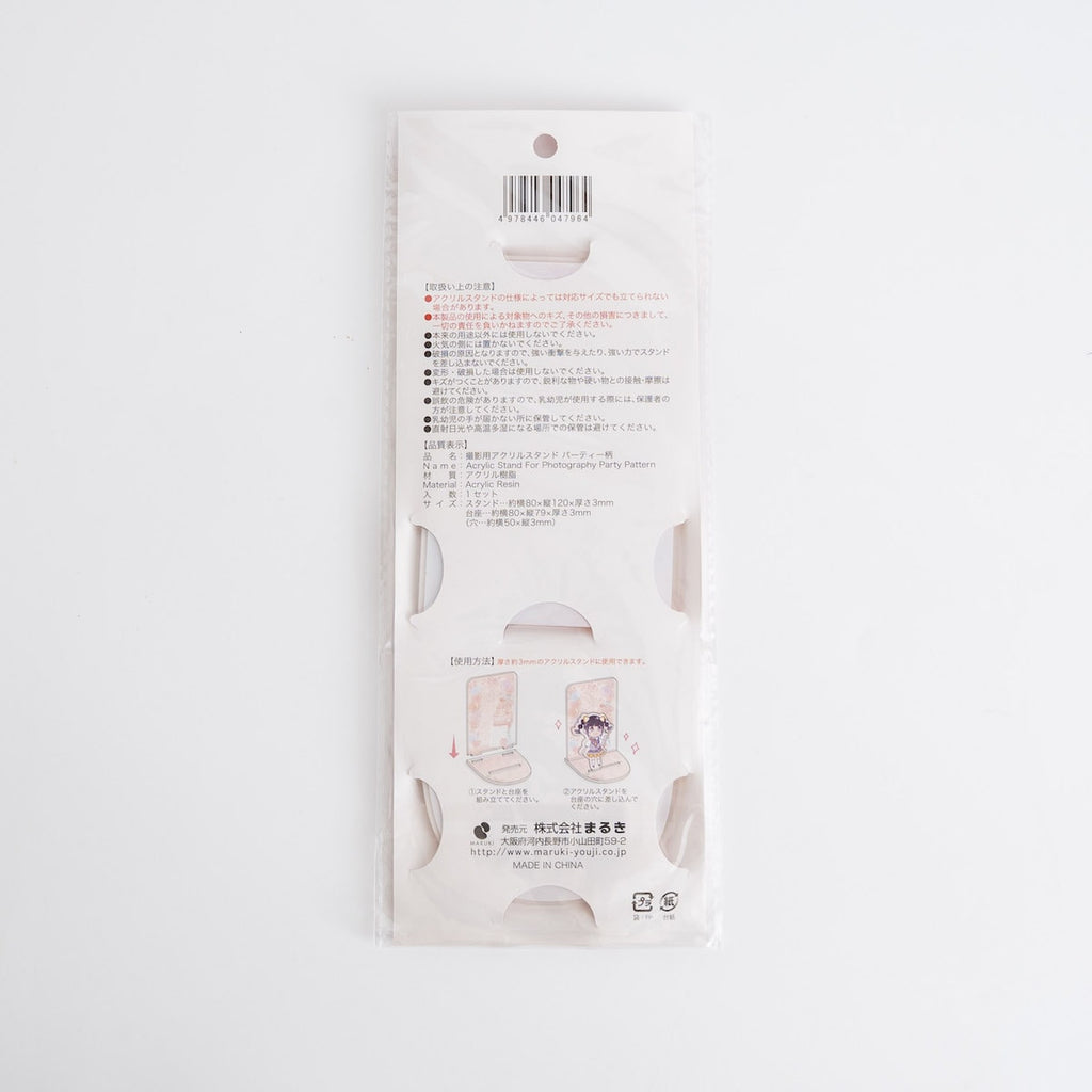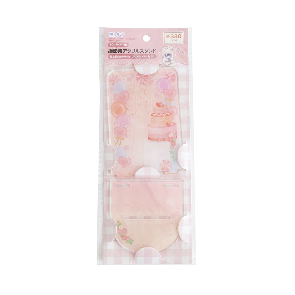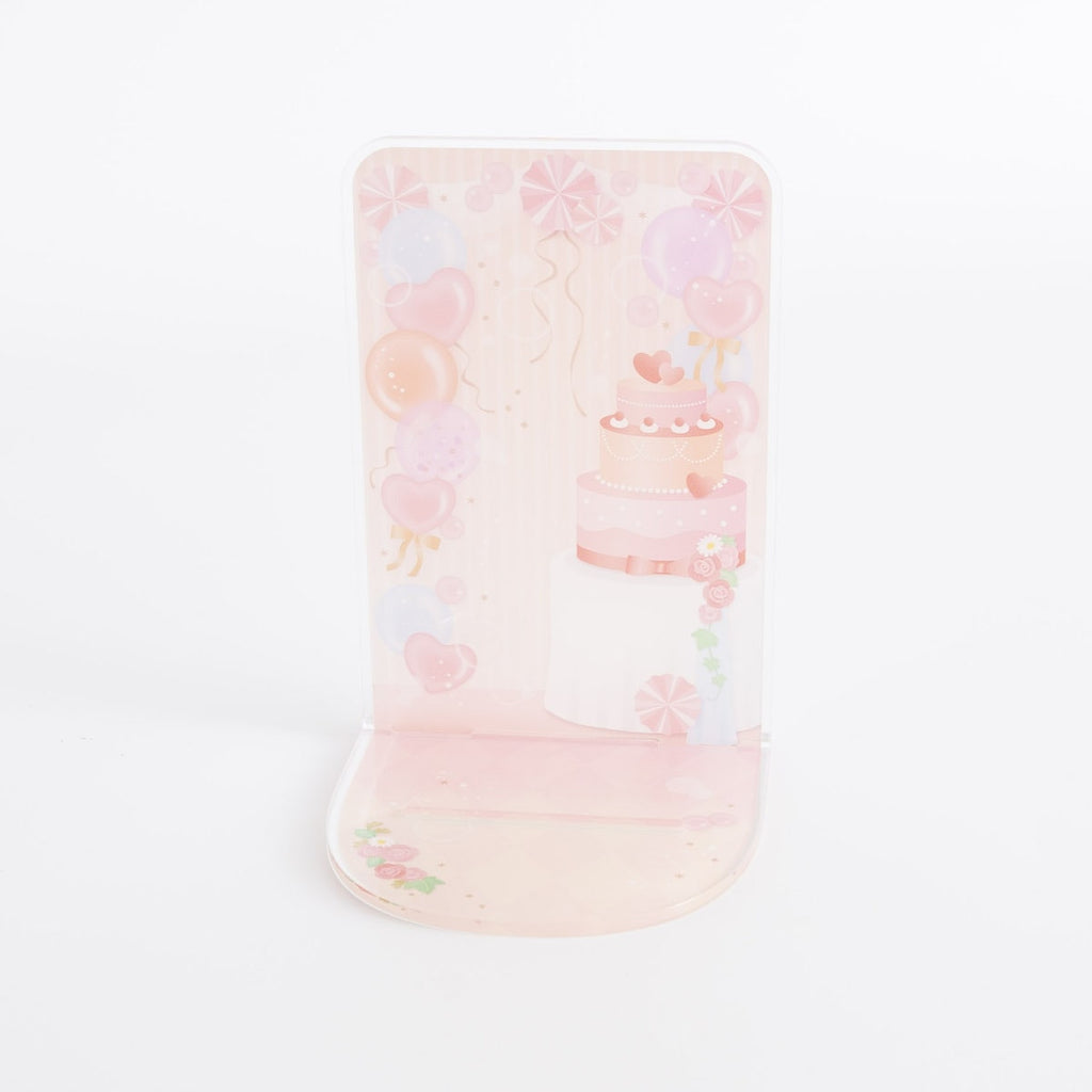 バルーンやケーキ、ハートの装飾が描かれたパーティー柄背景がセットになった撮影用アクリルスタンドです。誕生日や記念日の「推し活」を特別なものに演出できるデザインで、推しのアクスタを立てるだけで簡単に映える写真が撮影可能。自宅での飾りとしても存在感があり、記念の一枚がもっと思い出深いものになります。