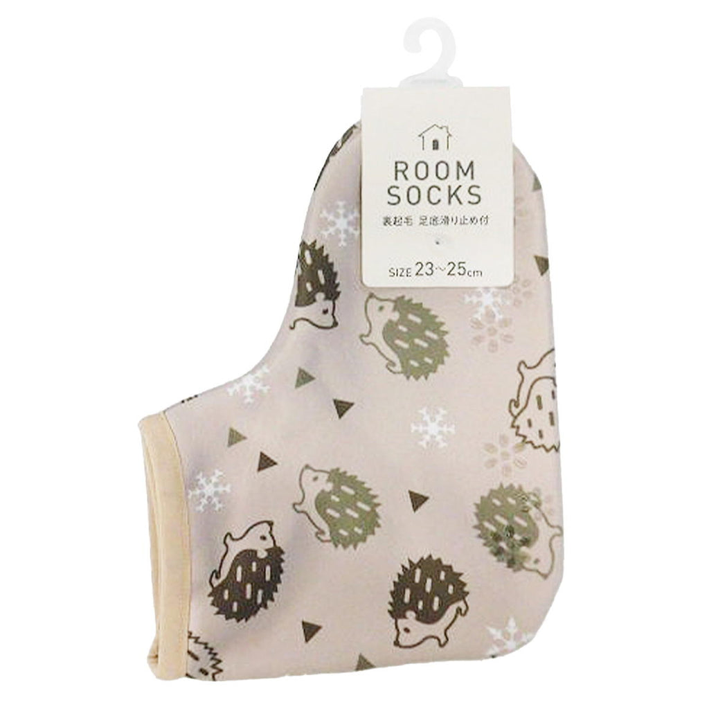 こちらのアイテムは、ハリネズミ柄がかわいい、内側裏起毛の薄手のルームソックスです。足底には滑り止め付き。