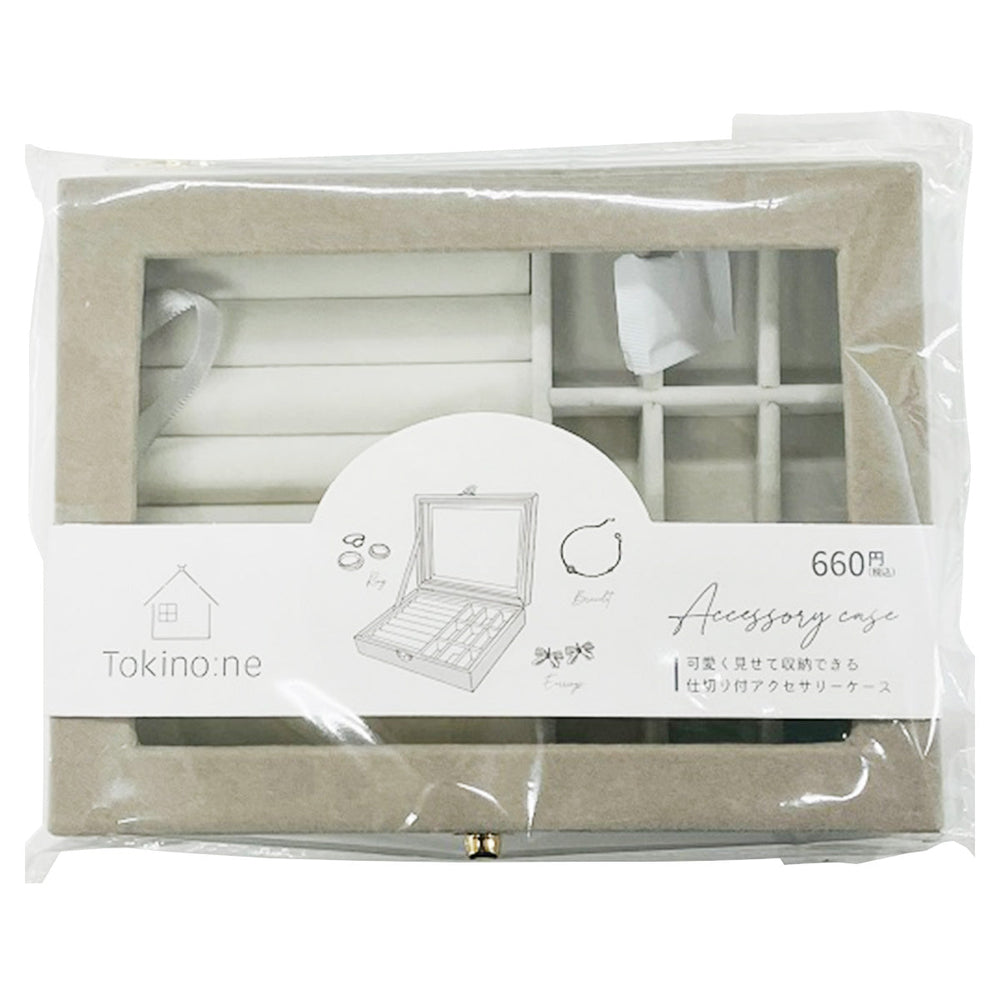 こちらの商品は、ワッツの雑貨店、Tokino:ne(ときのね)のラインナップ商品で、お気に入りのジュエリー類を、かわいく魅せて収納できる仕切り付のアクセサリーケースです。リング、ピアスやイヤリング、ブレスレットなど、小分けにして収納できます。上面がクリアタイプなので、中も見やすいです。