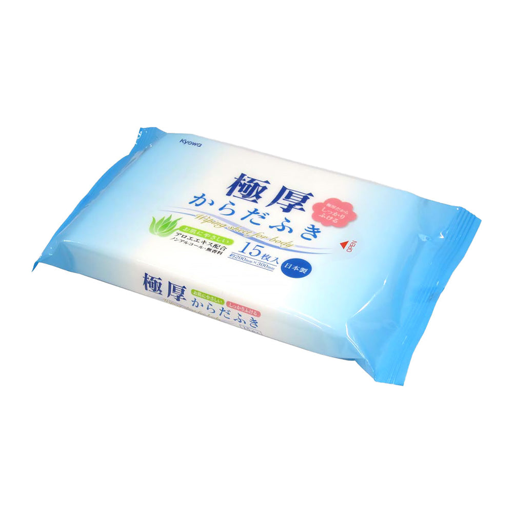 こちらのアイテムは、お肌にやさしいノンアルコール・無香料で、入浴できない時のからだふきに便利なウエットシートです。