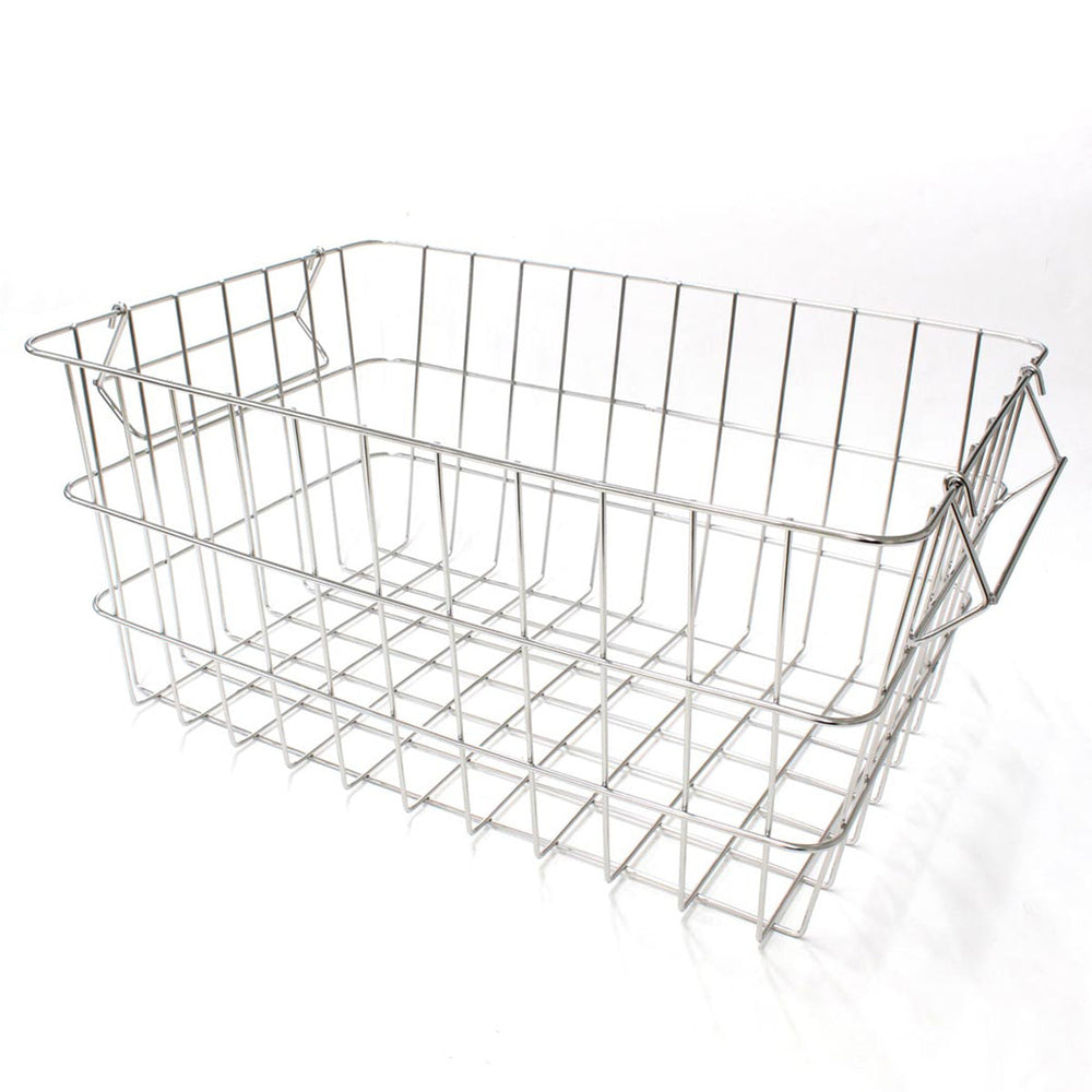 シルバー色のステンレス製ワイヤーバスケットです。錆びにくい素材を使用しています。サイズは約幅37cm×奥行26cm×高さ18cmです。キッチンや洗面所での使用に最適です。
