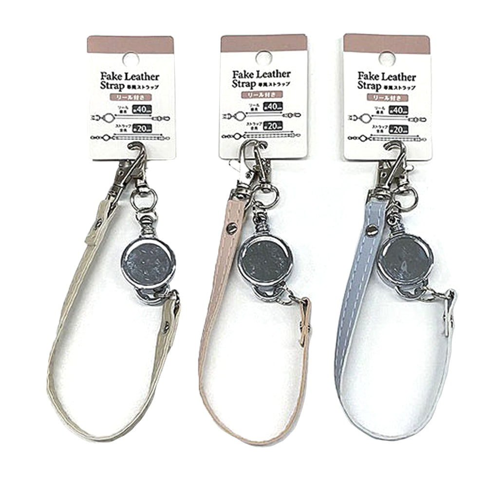 こちらのアイテムは、リール付きのストラップ。鍵などをつけてご使用いただけます。おしゃれなくすみカラーのフェイクレザー使用。カラーはアイボリー、ピンク、ブルーの3種類です。