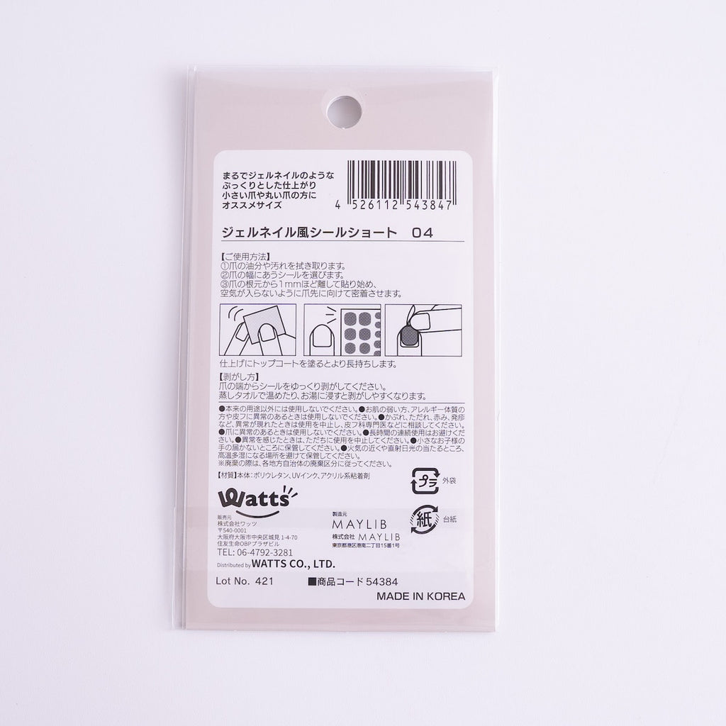 fasmyのショートネイルシールは、さまざまなカラーやデザインを展開。04番はシンプルなくすみカラーですが、他にもラメ系(PB. fasmy ジェルネイル風シールショート 10 品番:054400)、オレンジ系の華やかなタイプ(PB. fasmy ジェルネイル風シールショート 03 品番:054383)なども揃っています。シーンや気分に合わせて自由に選べるシリーズです。