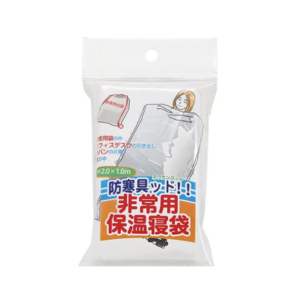 災害時や非常時に役立つ簡易防寒寝袋です。サイズは約200×100cmで、大人一人が十分に横になれます。アルミ素材を使用しており、体温を反射して保温性に優れています。