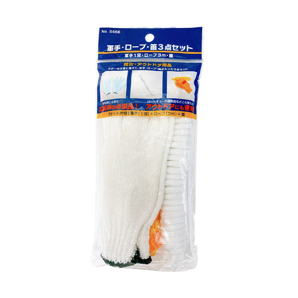 防災・遭難対策用の3点セットです。軍手、ロープ、笛がセットになっており、非常時に必要な道具がそろっています。