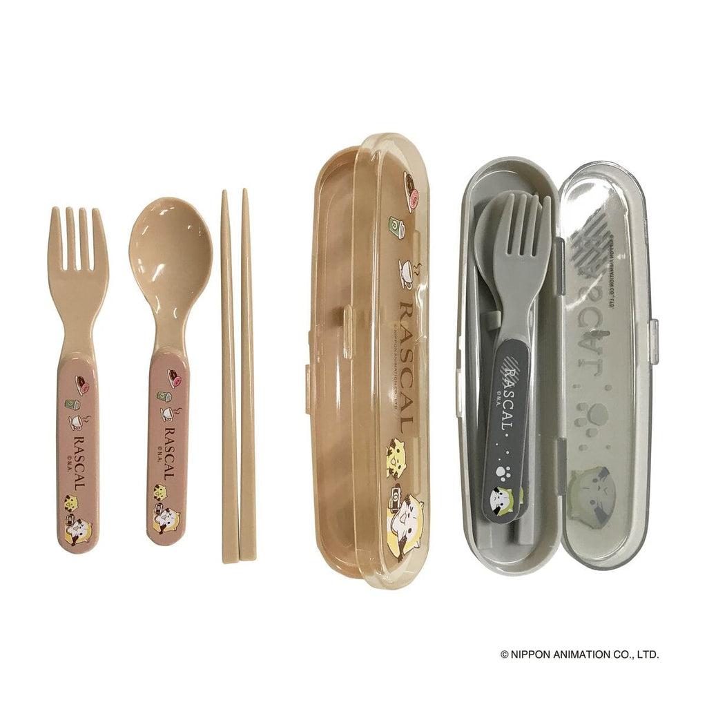 お弁当の時間が楽しくなる、かわいいラスカルがプリントされたお箸・スプーン・フォークのトリオセットです。
