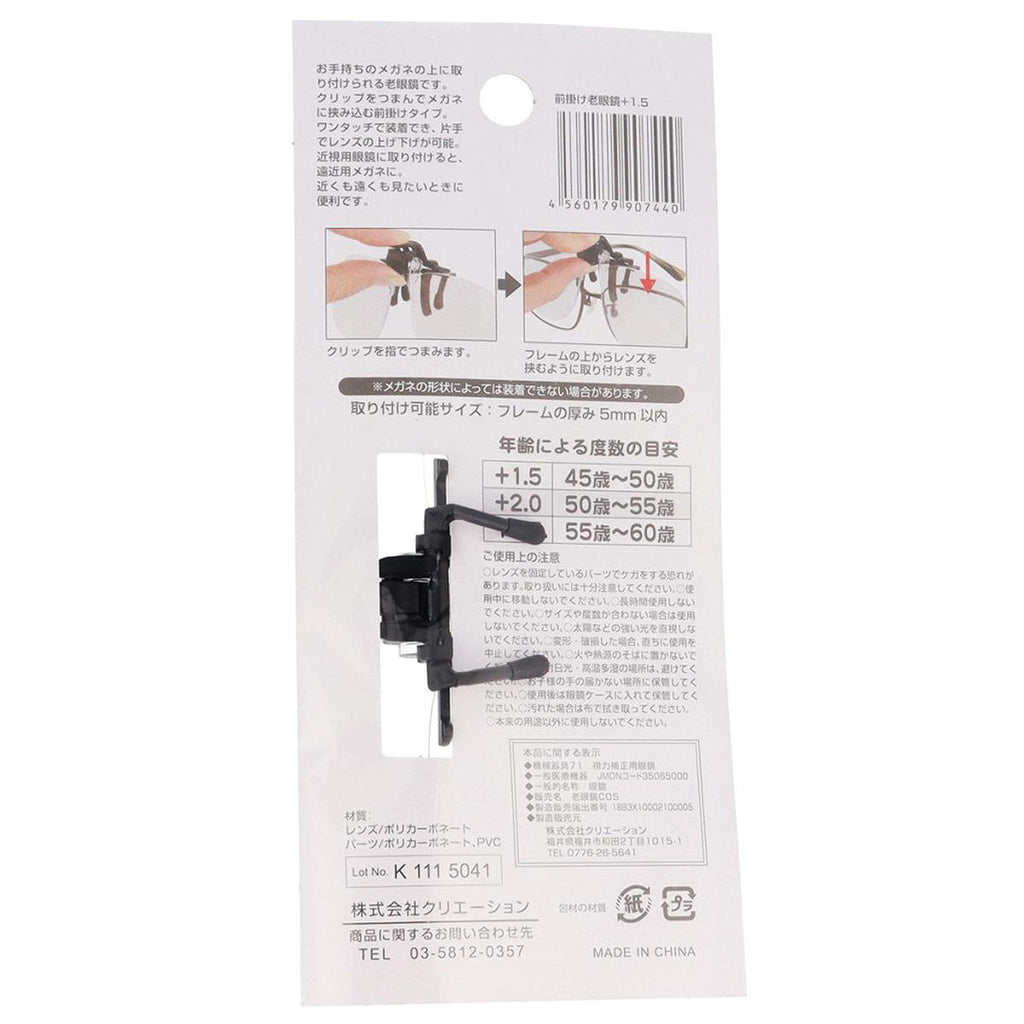 お使いのメガネに挟むだけのクリップアップ老眼鏡です。