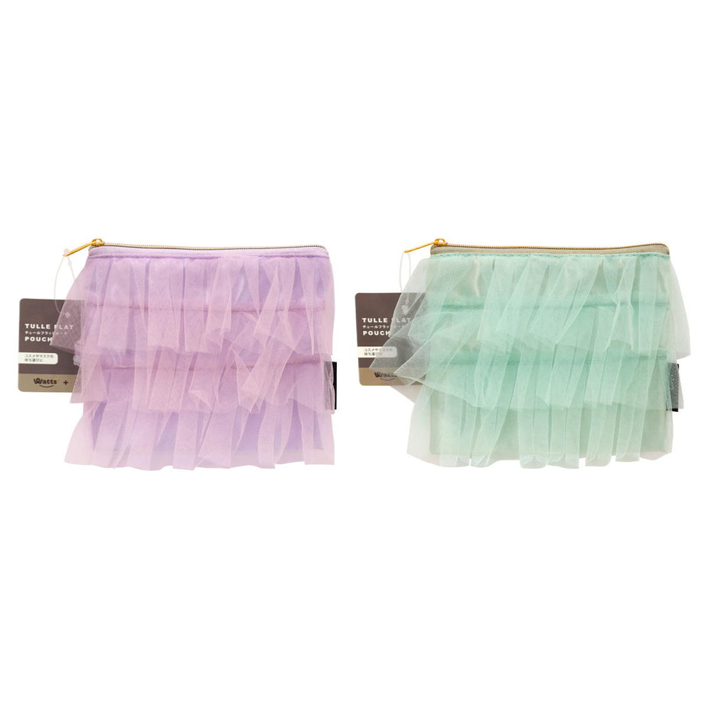 サテン生地にチュールフリルが付いたフラットポーチです。