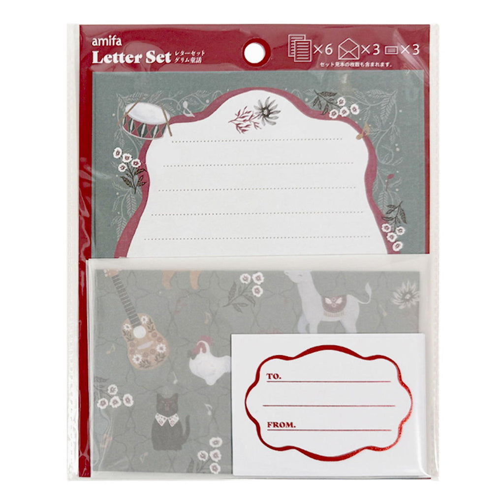 中の便箋の柄が透けて見えるタイプの封筒と、便箋、箔押しの宛名カードをセットにしたレターセットです。