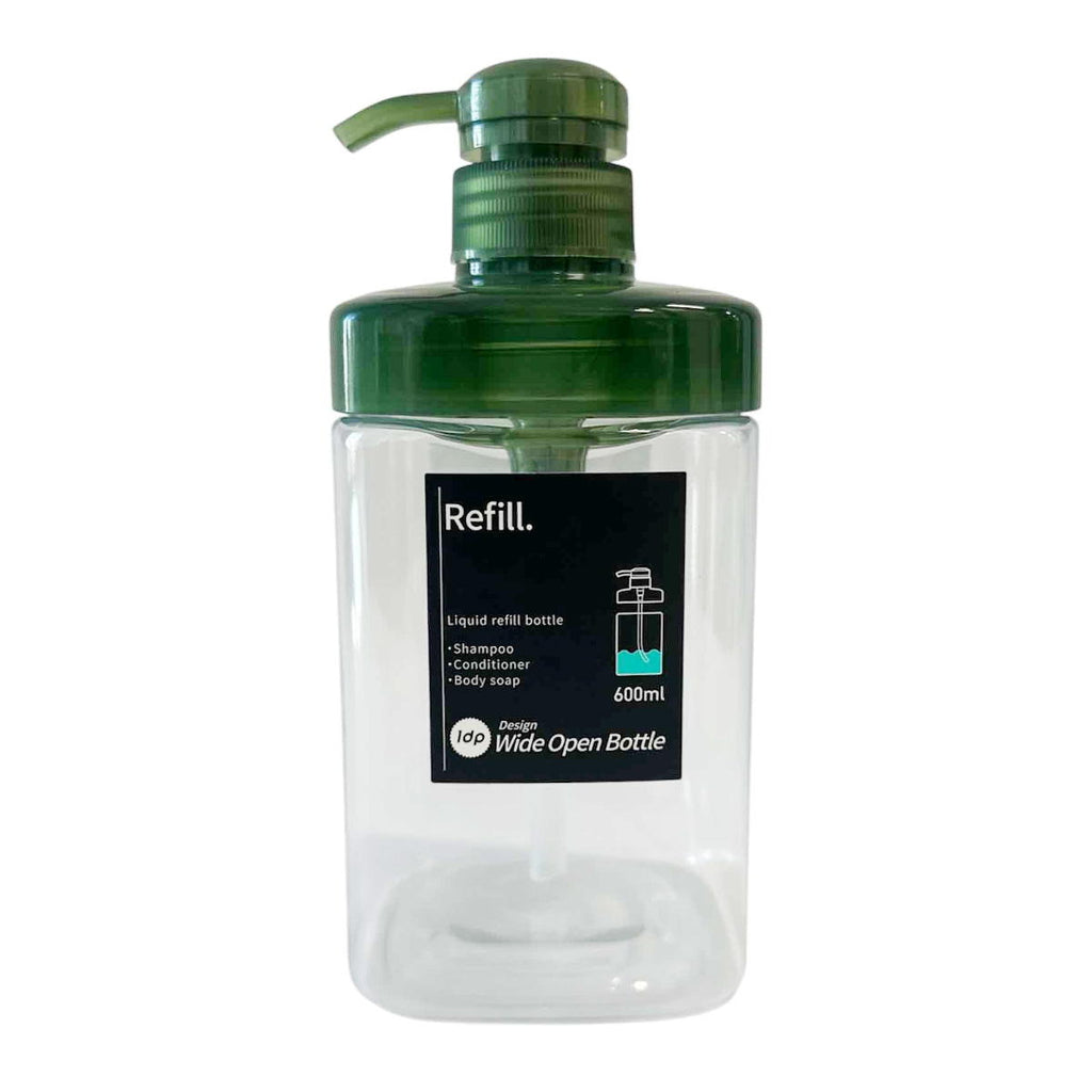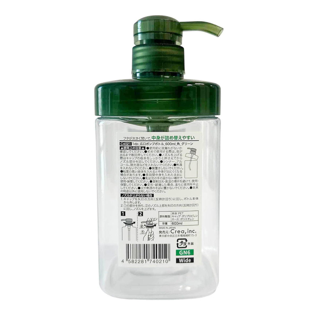 【在庫限り】1dp広口ポンプボトル600ML角グリーン 308101