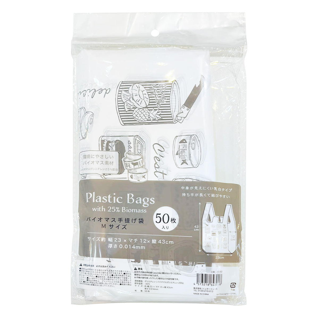 環境にやさしいバイオマス素材。バイオマスポリエチレン25%配合で中身が見えにくい乳白タイプ。持ち手が長くて結びやすい。