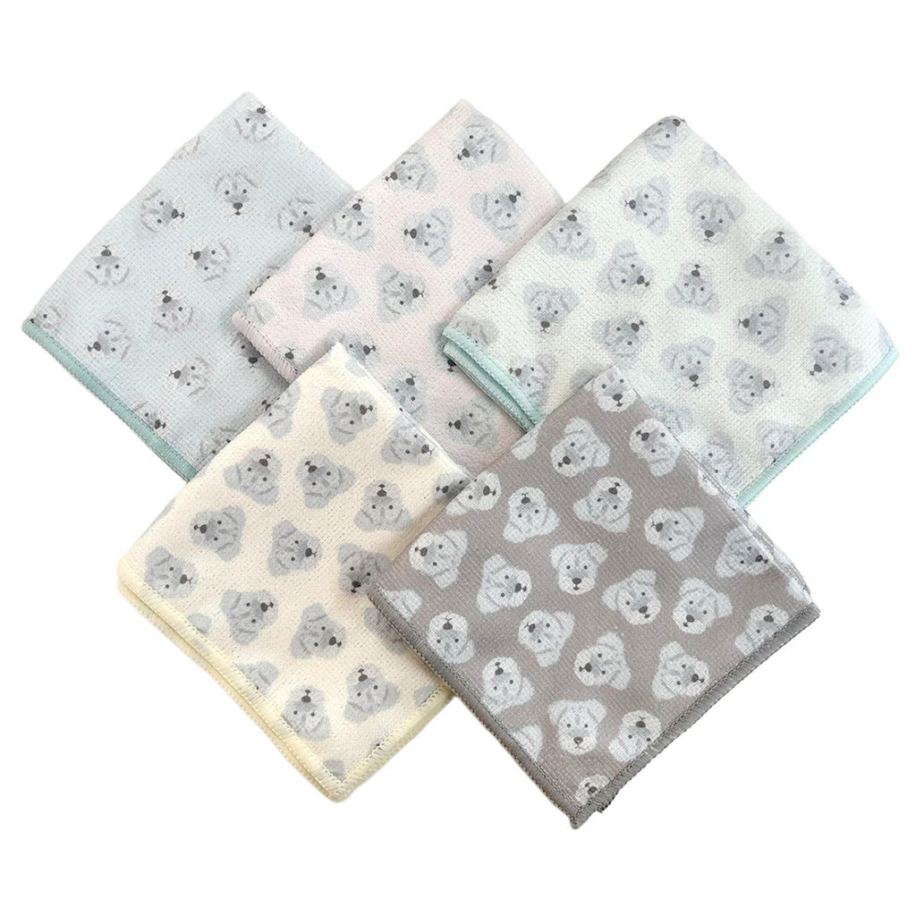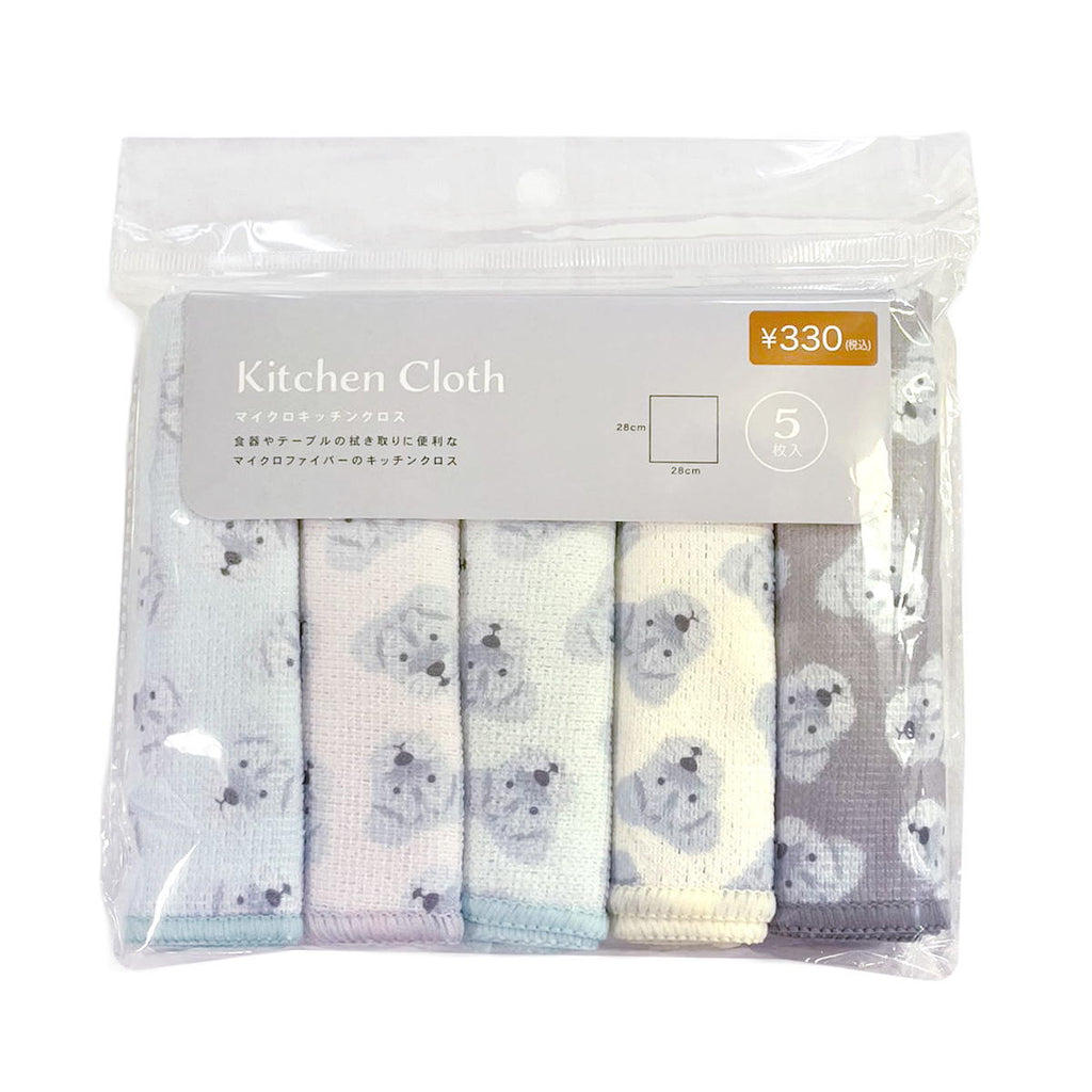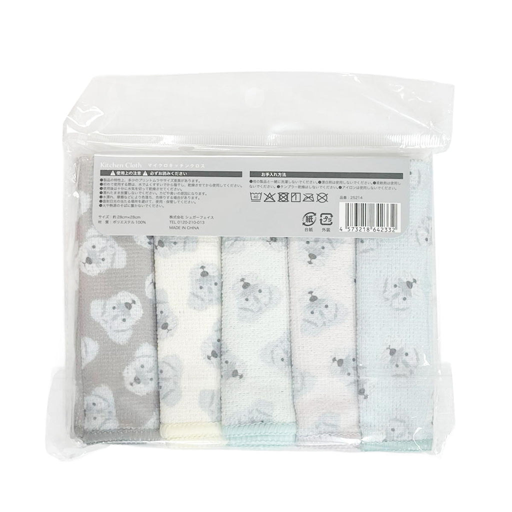 人気のシュナウザー犬プリントの食器やテーブルの拭き取りに便利なマイクロファイバーキッチンクロス、5枚セットです。