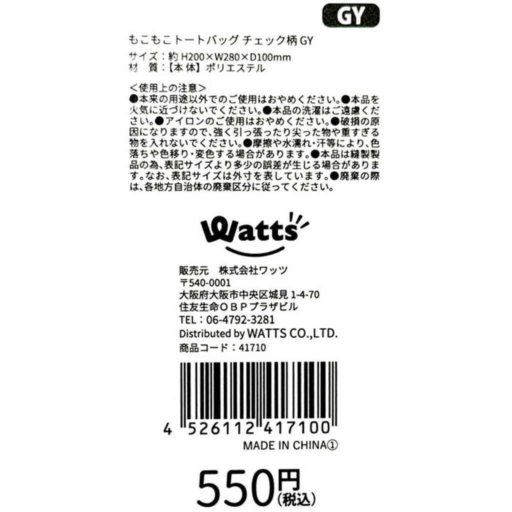 Tokinone PB.もこもこトートバッグ チェック柄 GY 041710