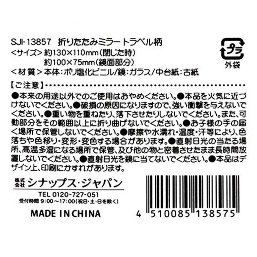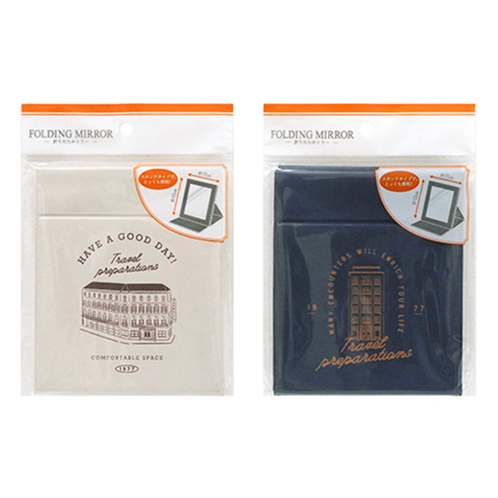 架空のホテルのデザインが印刷された折りたたみミラーです。