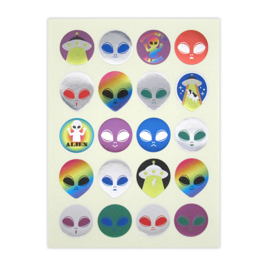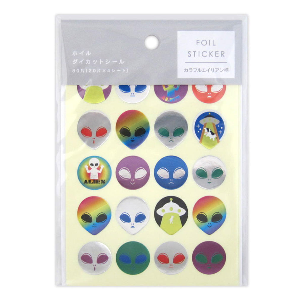 カラフルな宇宙人たちをデザインしたホイル素材のシールです。