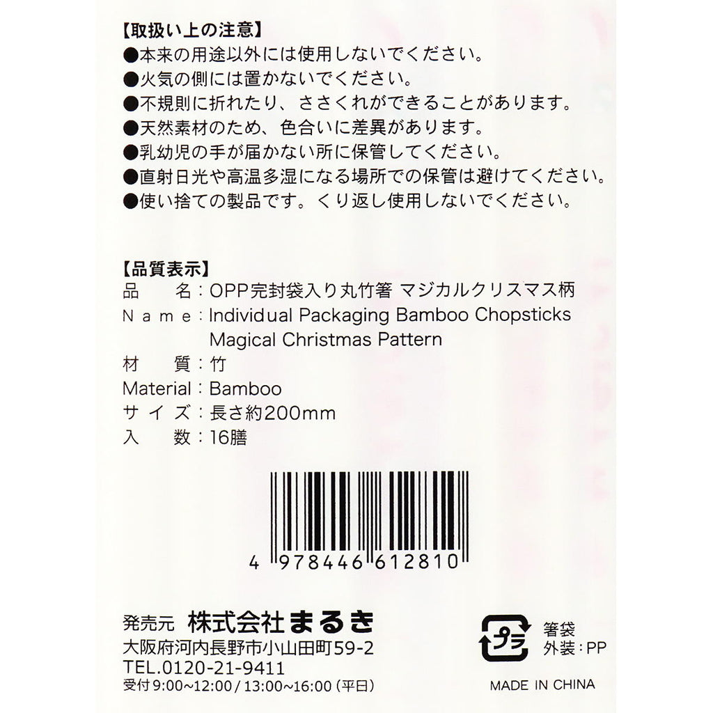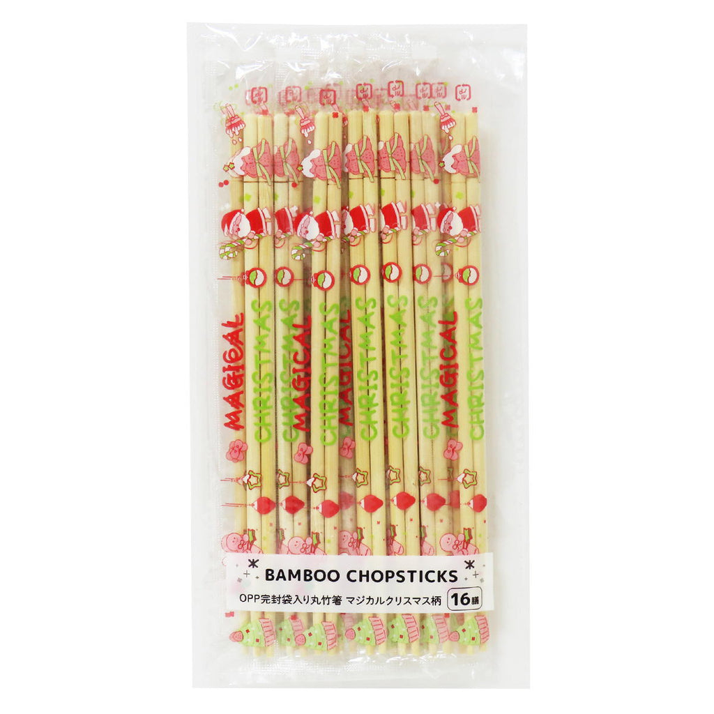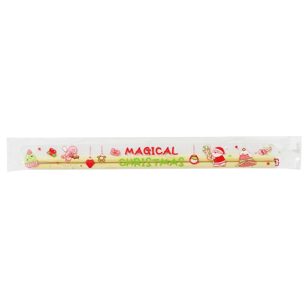 完封タイプの個包装袋入り丸竹箸、マジカルクリスマス柄。