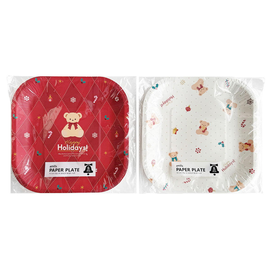 【在庫限り】ペーパープレート 8P スクエア ホリデーベア 302047