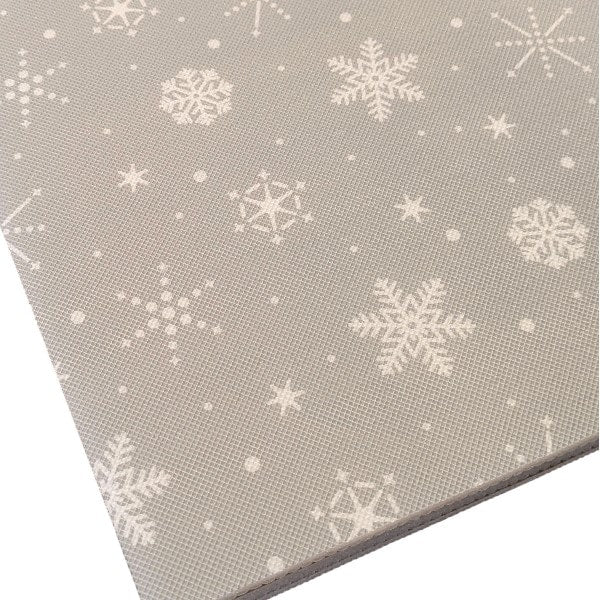落ち着いたグレーカラーに雪の結晶がちりばめられたデザインで、冬の季節感を演出しながらも主張しすぎない上品な印象に仕上がっています。室内の雰囲気を壊さず、リビングや玄関、寝室など、どんな空間にも自然に馴染みます。防寒対策と同時に見た目の心地よさも叶えるデザインです。
