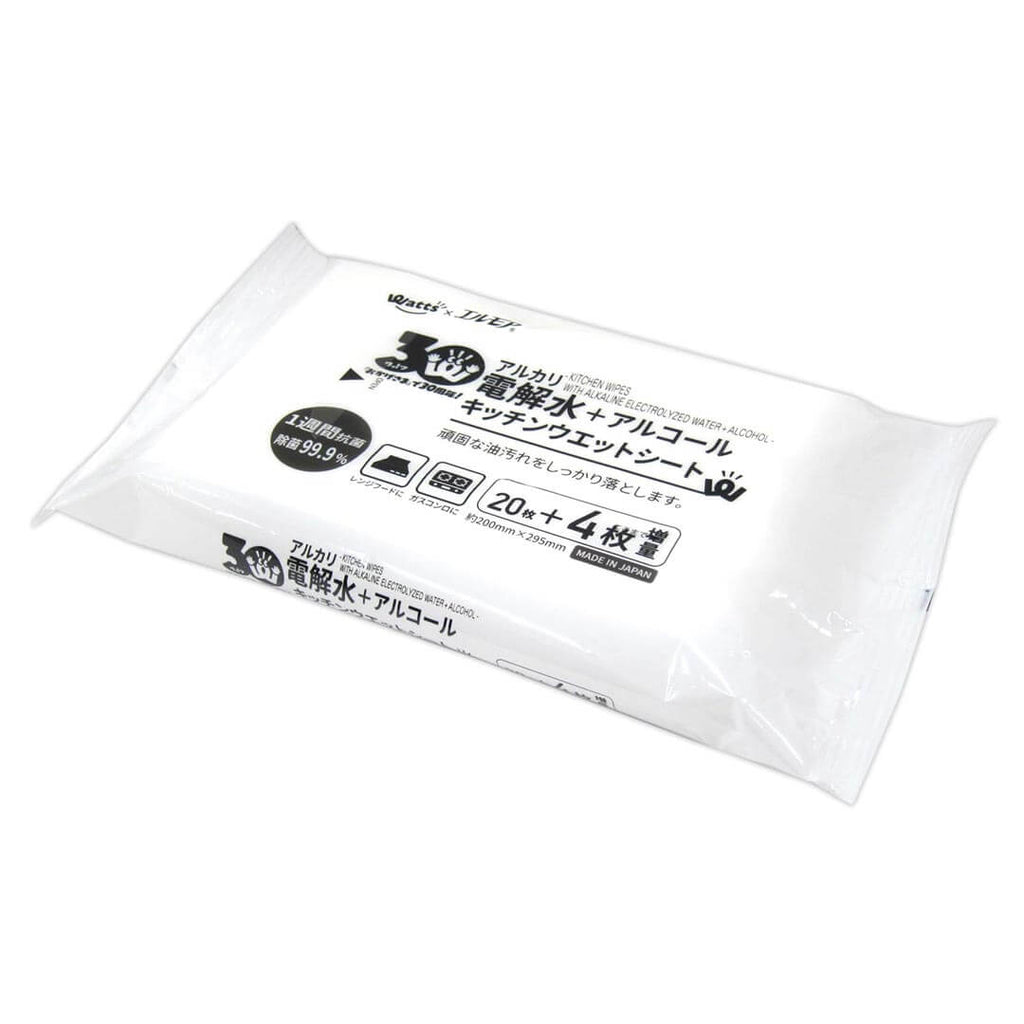 アルカリ電解水+アルコールのキッチンウエットシートです。