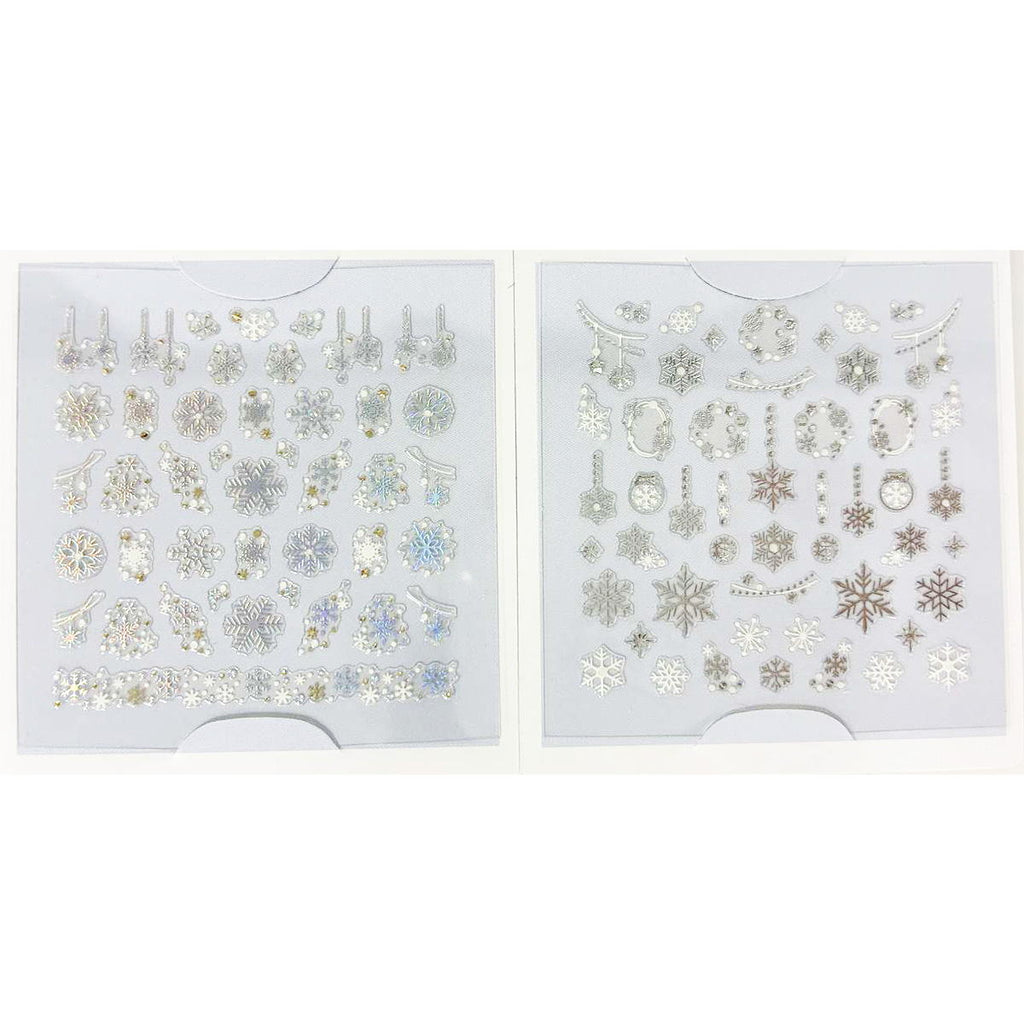 ホワイト、オーロラ、ゴールドの雪の結晶をベースに、キラキラしたストーンモチーフを加え、ベーシックながら使いやすいデザインに。