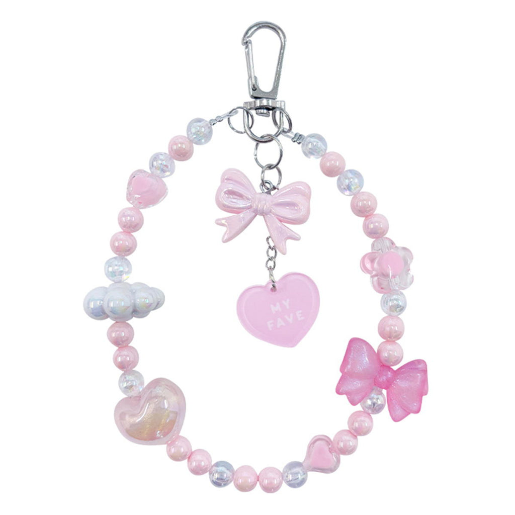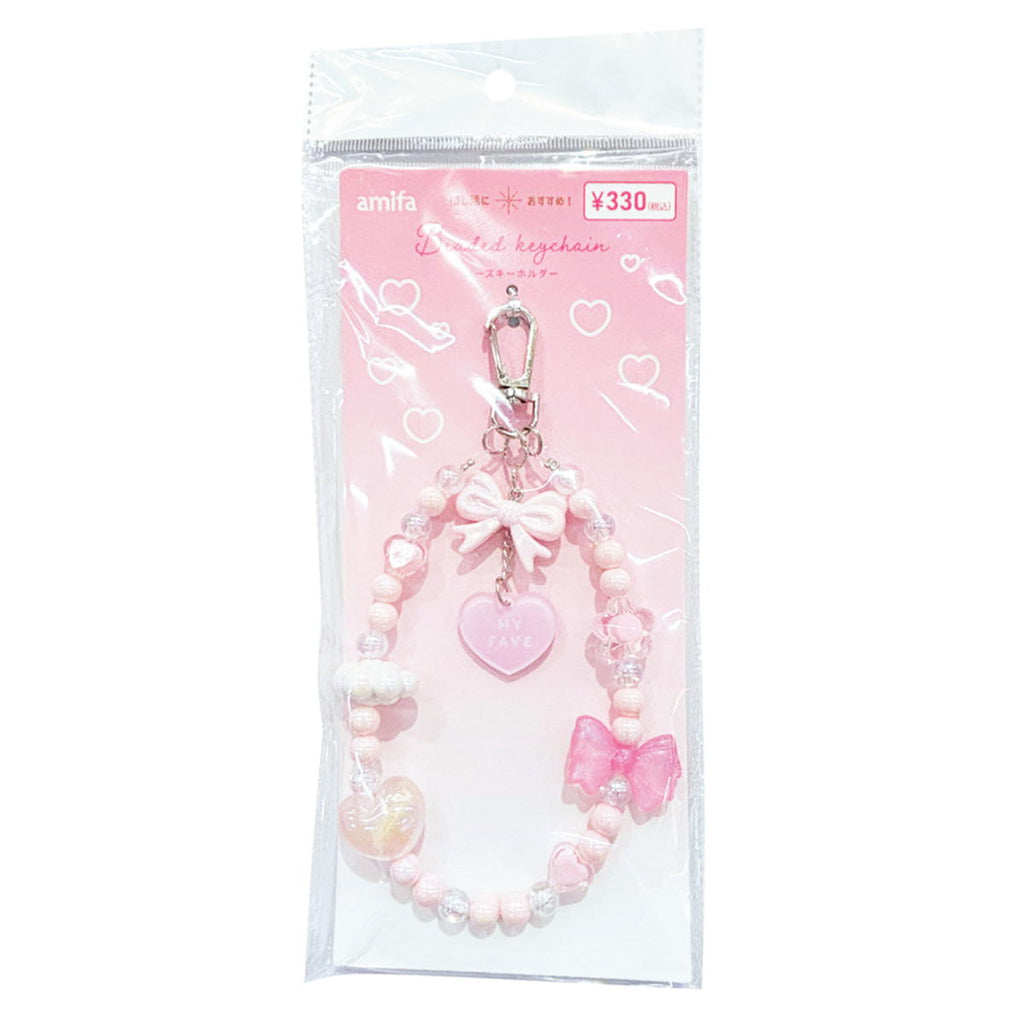 ビーズキーホルダー、リボンチャーム、ハート型アクリルチャーム3点のキーホルダー。