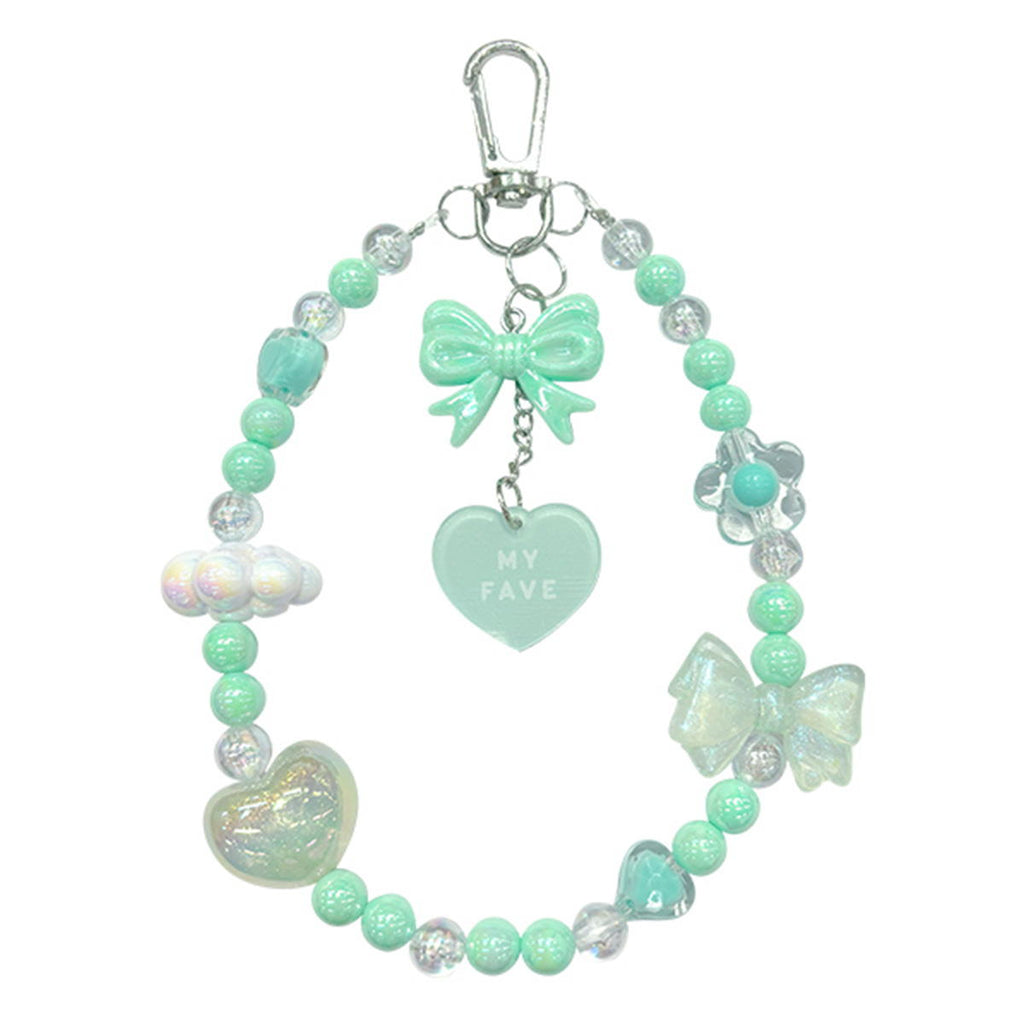 ビーズキーホルダー、リボンチャーム、ハート型アクリルチャーム3点のキーホルダー。