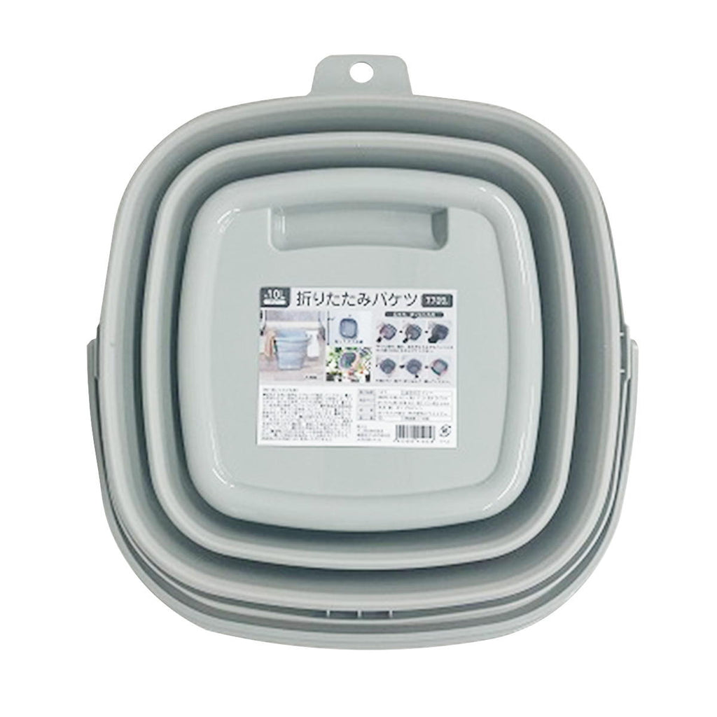 折りたたみ可能な10リットルバケツです。グレー色で、約W305×D315×H247mmのサイズ。使わない時は最小限の容積まで折りたためます。