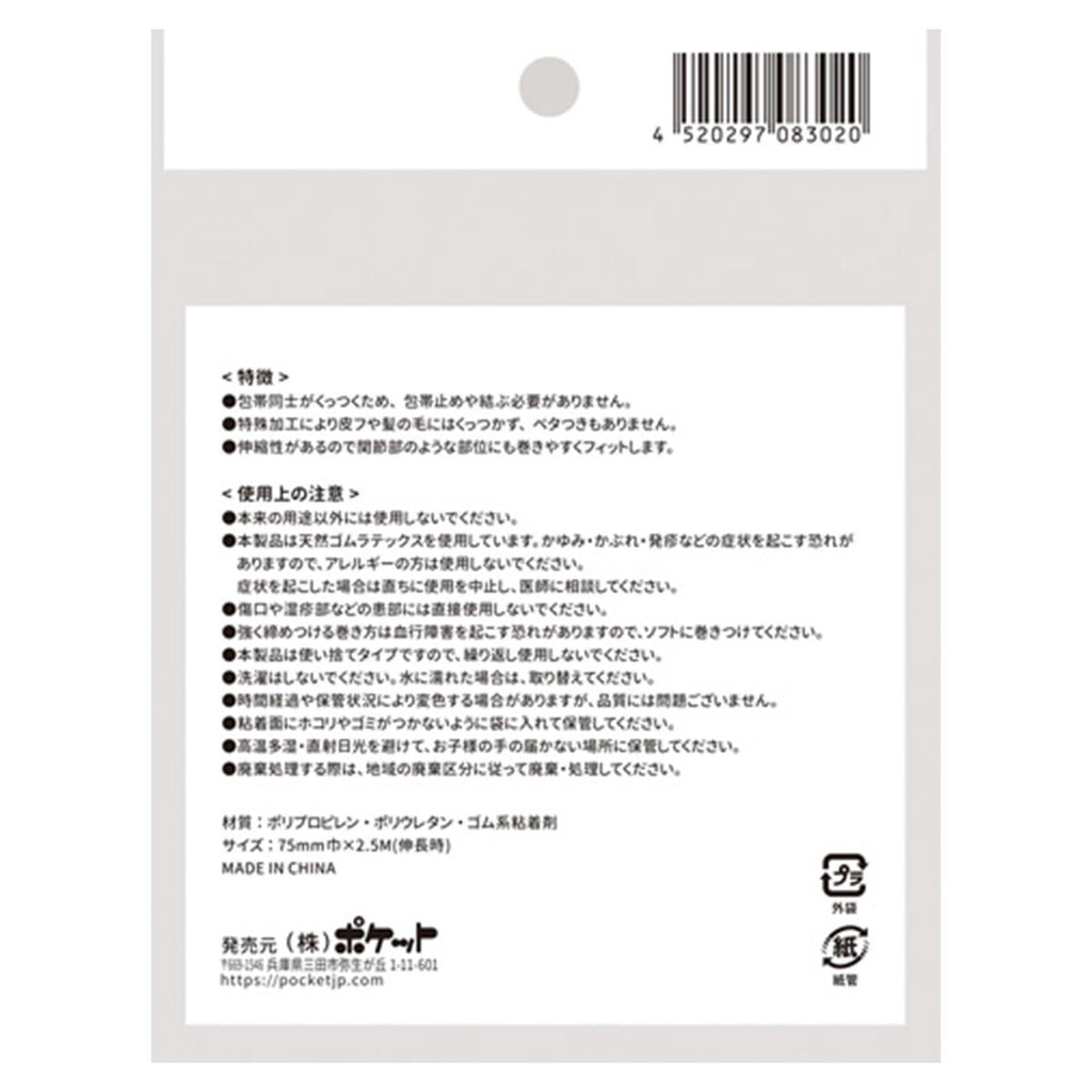 肌に付かず、重ねて巻いて包帯同士だけが付く。75mm巾×2.5M(伸長時)