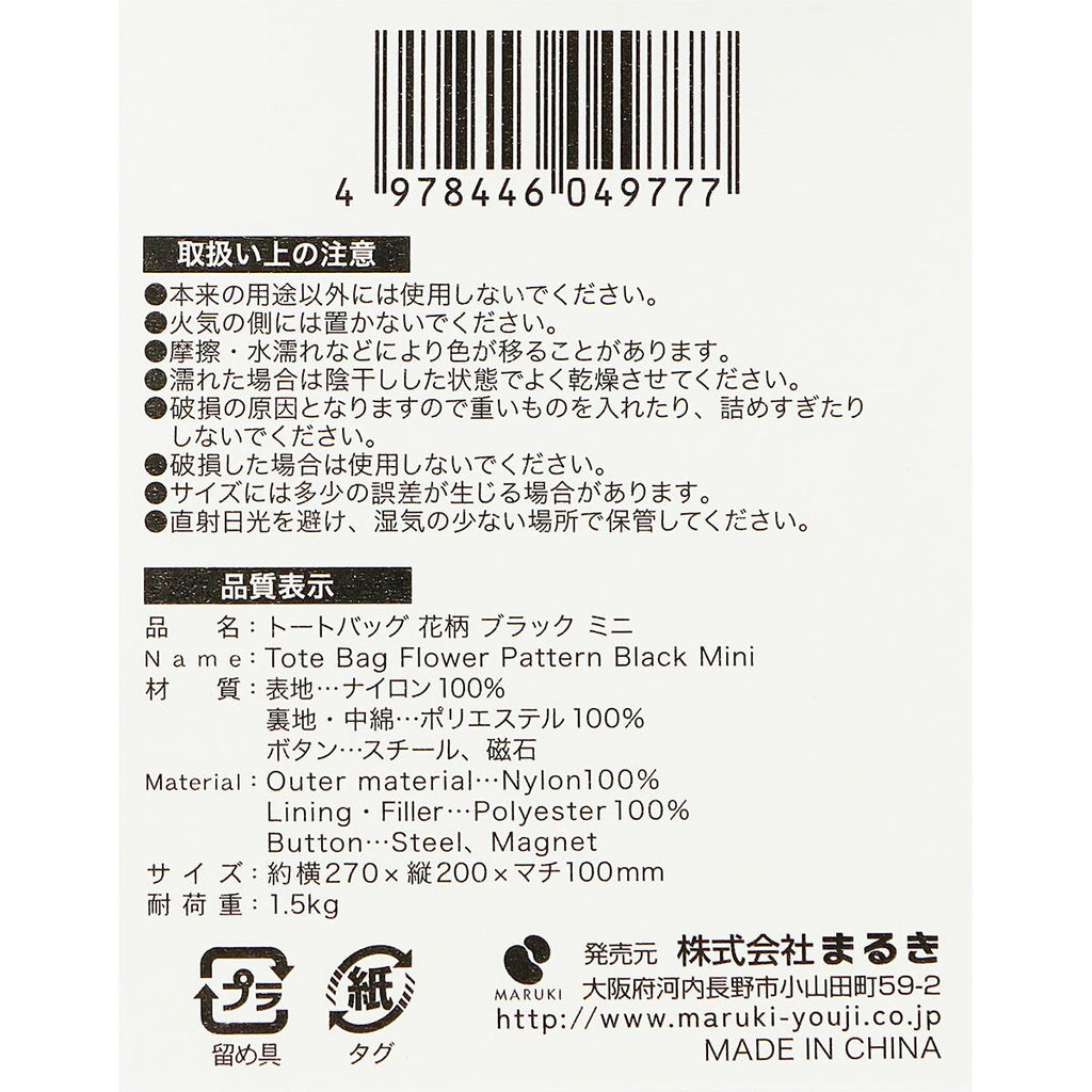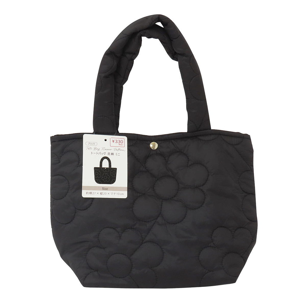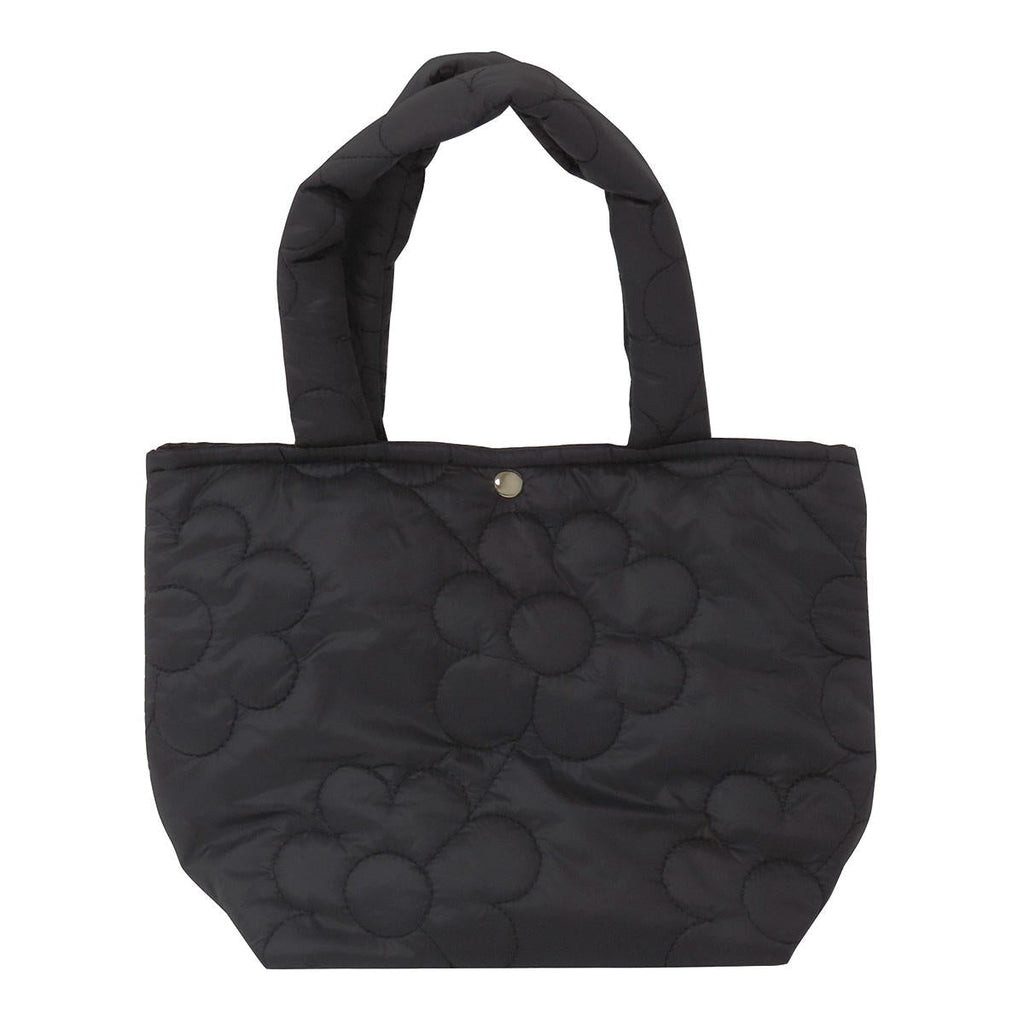 中綿入りのフワフワした素材の花柄トートバッグ、黒色ミニサイズ。
