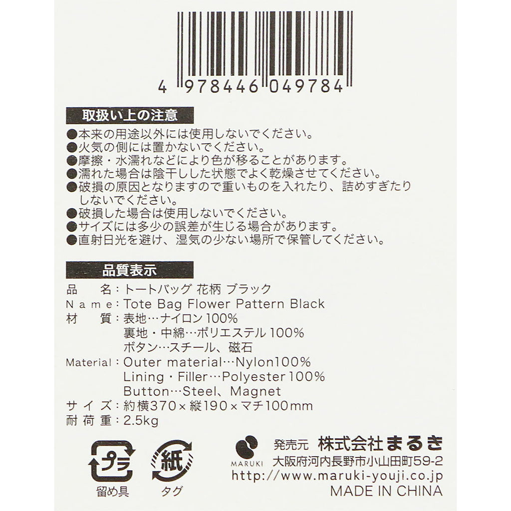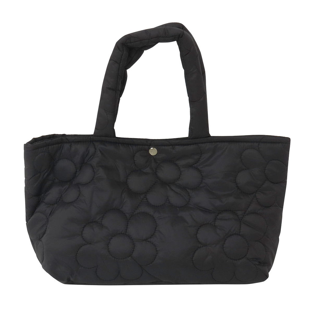 中綿入りのフワフワした素材の花柄トートバッグ、黒色。
